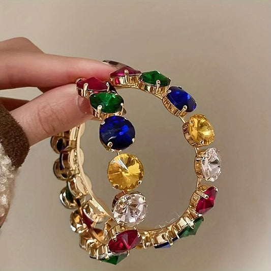 Large Bohemian Hoop Earrings with Colorful Rhinestones - Multicolor