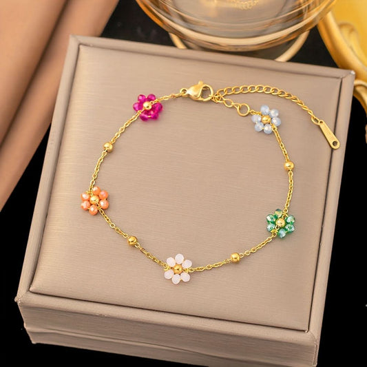 Add a touch of elegance and charm to your everyday look with this Boho Floral Chain Bracelet for Women. Handcrafted with intricate detail, this bracelet features colorful small flower accents set against a golden stainless steel chain, creating a harmonious blend of bohemian and...- ₹ 629