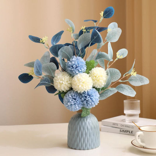 Ceramic Vase with Artificial Flowers - White + dark blue + blue rope bottle