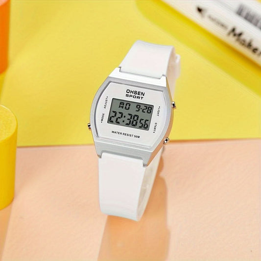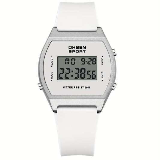Women’s Digital Sports Watch – Luminous Display, Square Zinc Alloy Case, Silicone Strap - White