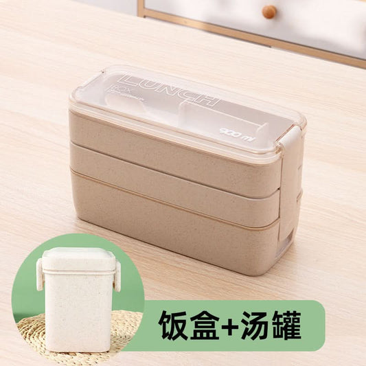 Three-Layer Microwave-Safe Bento Lunch Box with Soup Can – 900ml - Beige