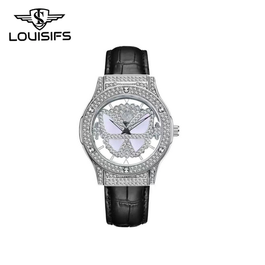 LOUISIFS Luxury Star & Clover Ladies Watch – Hollow Rotating Dial, Diamond Design - White