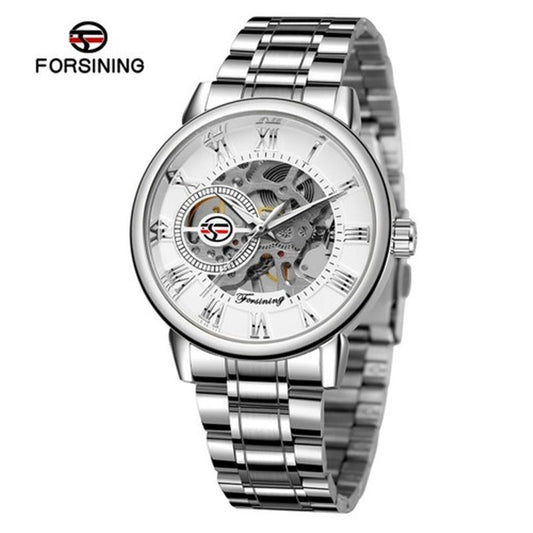 FORSINING Men's Skeleton Mechanical Watch – Roman Dial, Classic Hollow Face Design - White