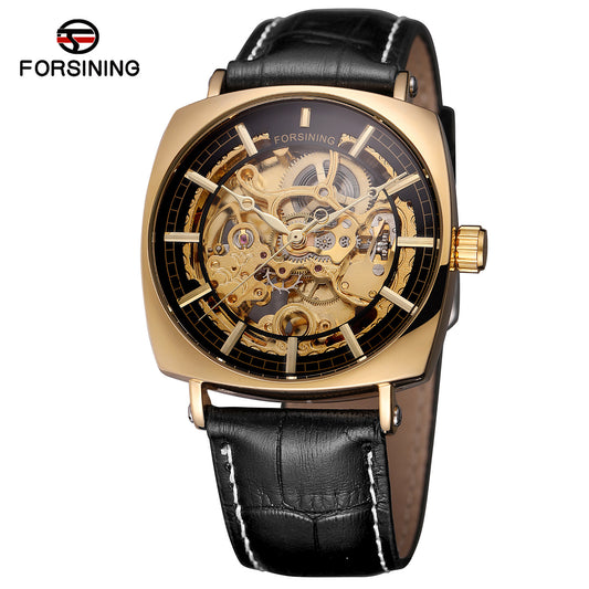 Forsining Men's Waterproof Mechanical Watch – Square Skeleton Dial with Leather Strap - Black-gold