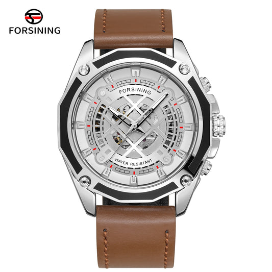 FORSINING Men's Skeleton Mechanical Watch – Luminous Dial, Fashion Automatic Timepiece - Brown-white