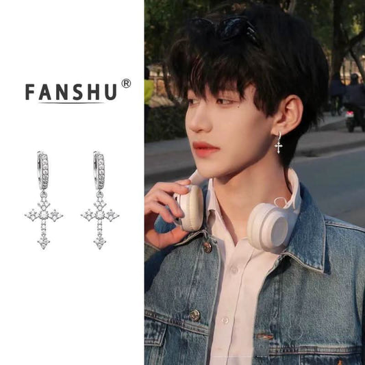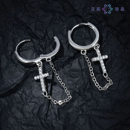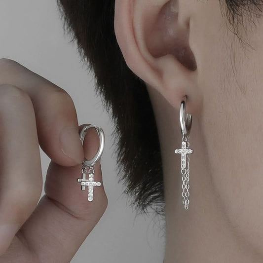 Men’s Stylish Cross Chain Earrings with Tassels – Hip-Hop Diamond Stud - Silver