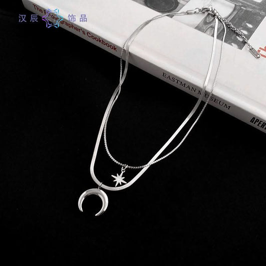 Men's Double-Layer Moon Necklace – Star and Moon Pendant - Silver
