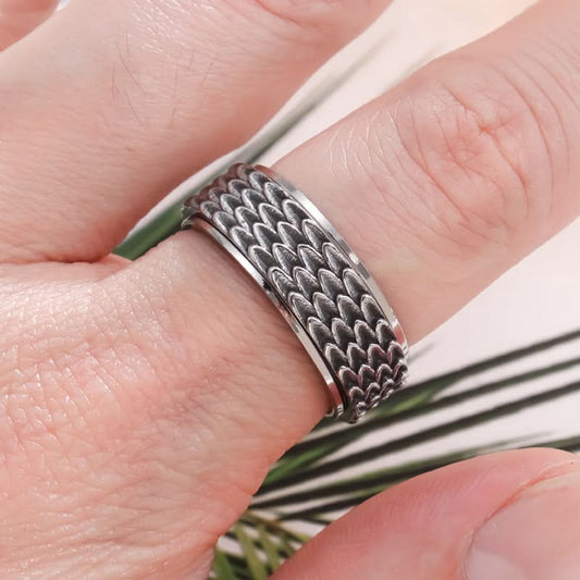 Unleash your bold style with this men’s stainless steel dragon scale ring, a symbol of strength and resilience. Designed with an intricate textured dragon scale pattern, this rotatable band adds a unique fidget-friendly element, perfect for those who appreciate both style and functionality. Crafted...- ₹ 799