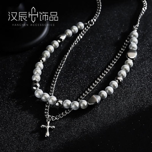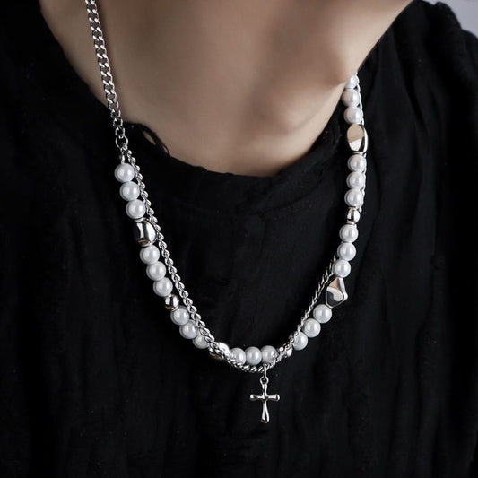 Men’s Trendy Pearl Cross Necklace – Layered Jewelry - Milky White