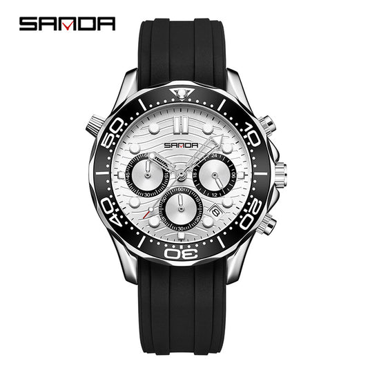 SANDA Men's Silicone Sports Watch – Waterproof Quartz with Calendar & Three-Eye Design - Silver