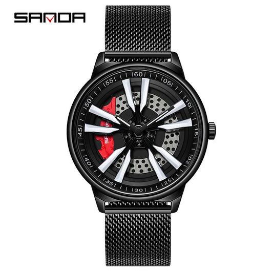 Sanda Men's Quartz Watch – Hollow Wheel Dial, Mesh Steel Strap, Waterproof Timepiece - Black