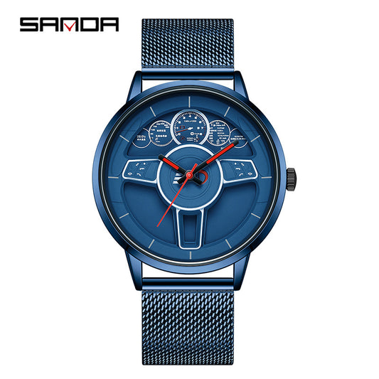 SANDA Steering Wheel Men’s Quartz Watch – Mesh Strap Waterproof Business Wristwatch - Blue