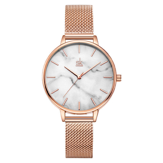 SK Women’s Quartz Watch – Marble Pattern Dial, Thin Strap, 30M Waterproof - Black