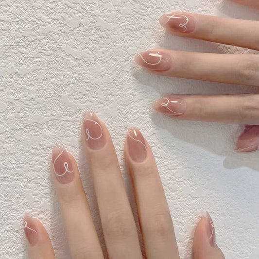 Nude Almond Press-On Nails with Swirl Design – Medium Acrylic Nail Set - Nude