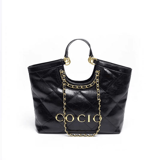 Black Faux Leather Tote Bag with Chain Strap - Black