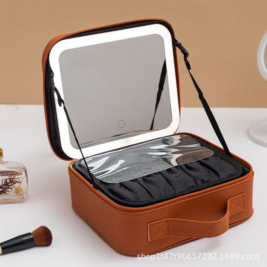 Portable Makeup Bag with Lighted Mirror - Dark Brown