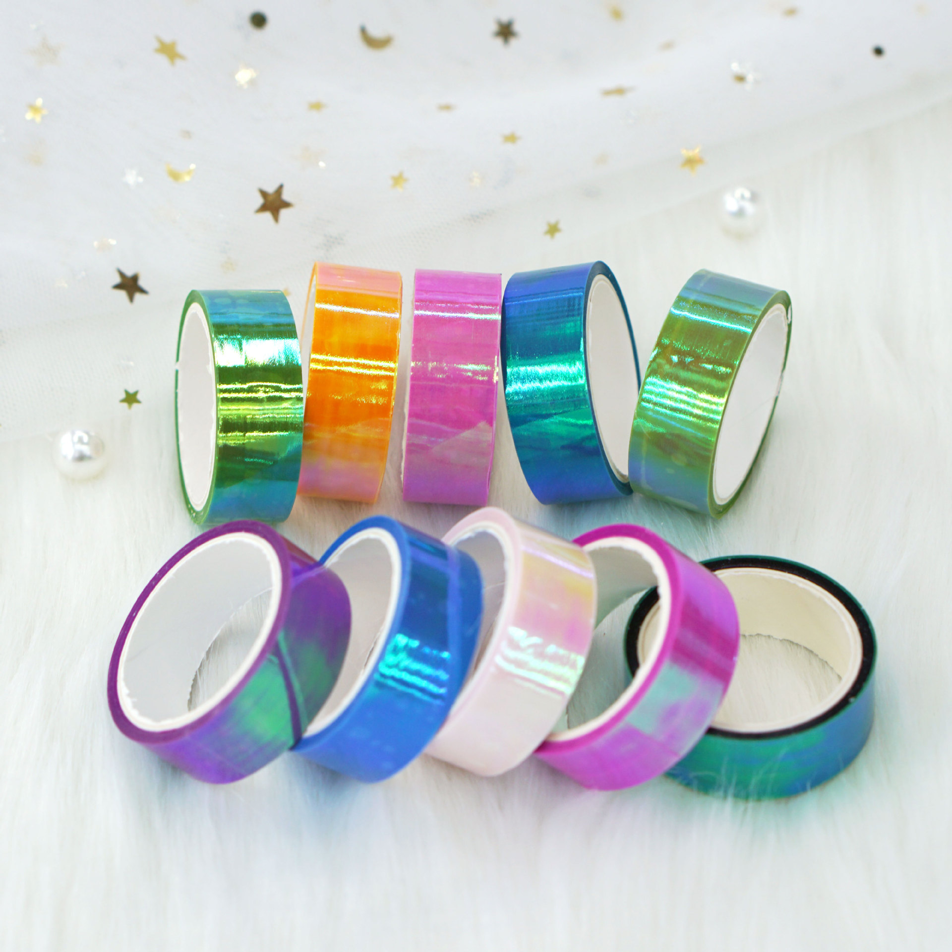 Unleash your creativity with our set of 10 rolls of Rainbow Laser Film Tape! Each roll features a stunning gradient mermaid design that adds a magical touch to your DIY projects, journaling, and craft creations. Measuring 3 meters in length and 1.5 cm in width, these versatile tapes are perfect for decoration and personalization.