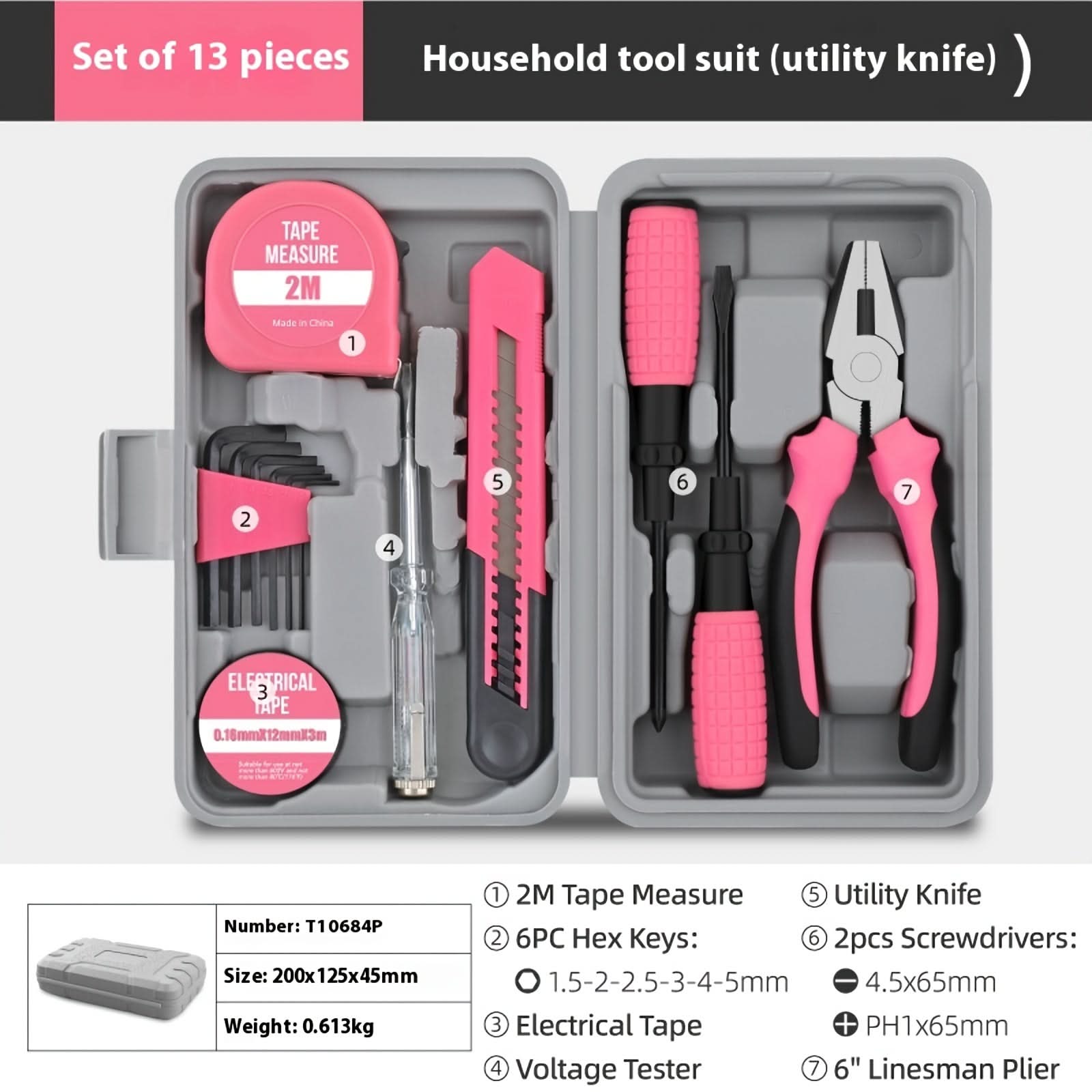 Handle everyday repairs with confidence using this 13-piece pink home repair tool set. Designed for style and functionality, this kit features high-quality alloy tools built for durability and precision. The set includes essentials like a screwdriver, pliers, and Allen wrench, ensuring you have everything you need for routine maintenance tasks around the house.