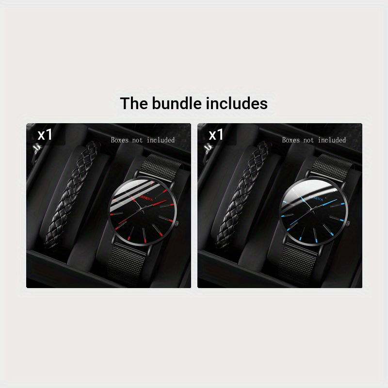 This 2-piece set features sleek black round quartz watches with PU leather straps and plastic dials, complemented by matching bracelets. A versatile gift for both women and men, offering style and practicality.