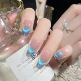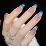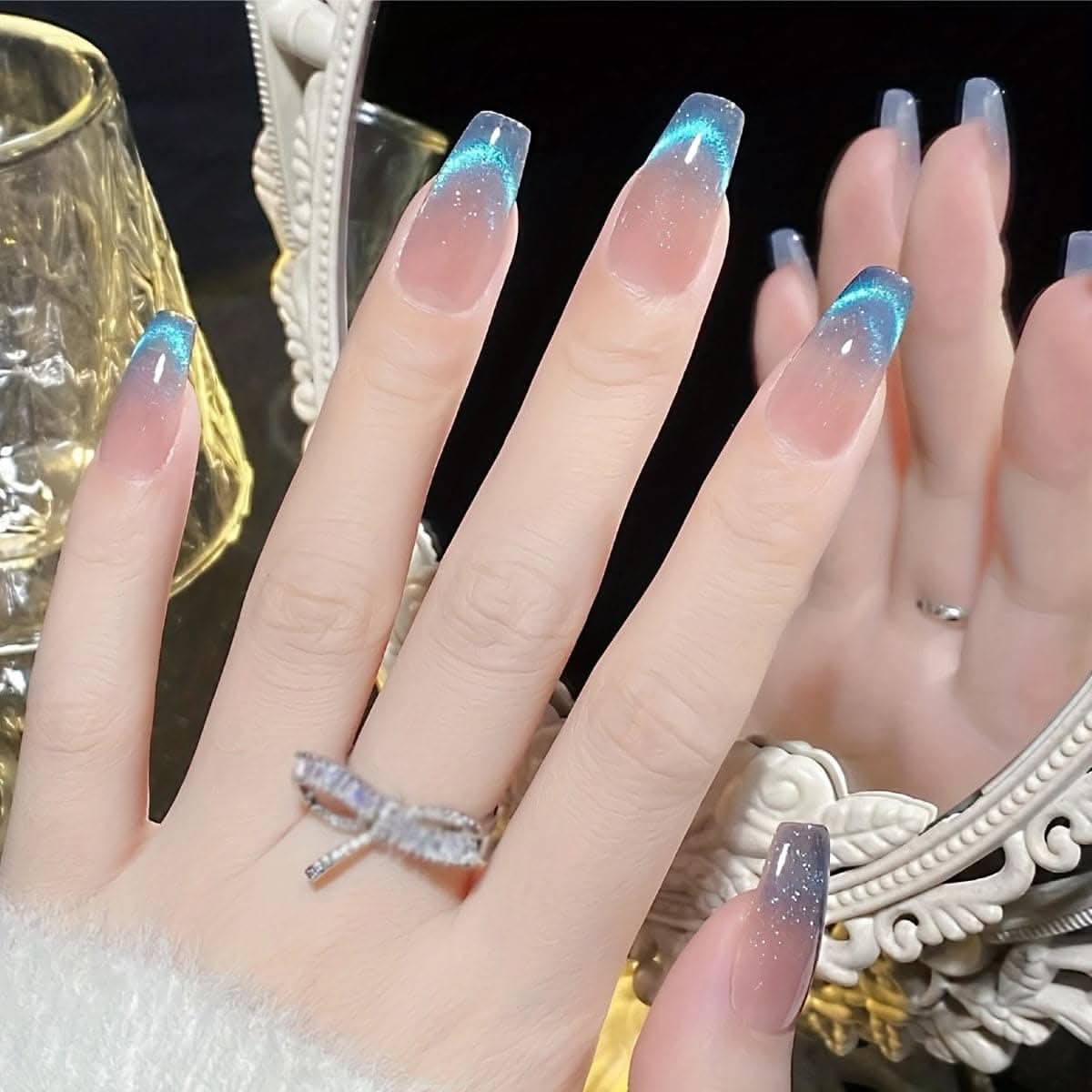 This 24-piece set features aurora blue gradient press-on nails with a glittery chameleon effect and long ballet shape. Perfect for women and girls, it includes jelly adhesive and a nail file for easy application and a dazzling finish.