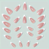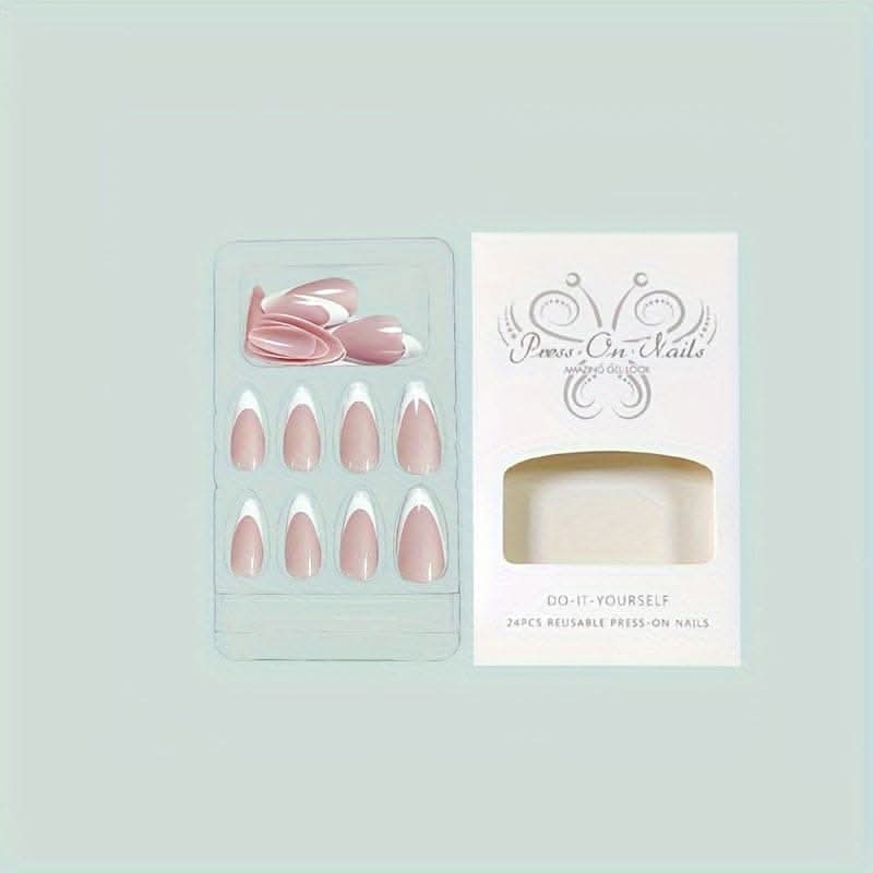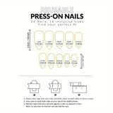 This set includes 24 medium almond-shaped press-on nails with a stylish French tip design. Full cover and perfect for women and girls, it comes with a nail file and jelly glue for easy application and a flawless manicure.