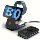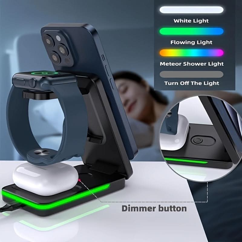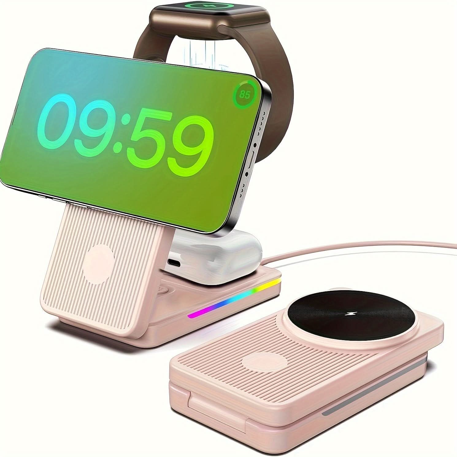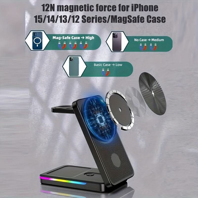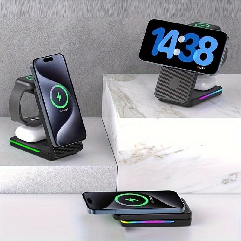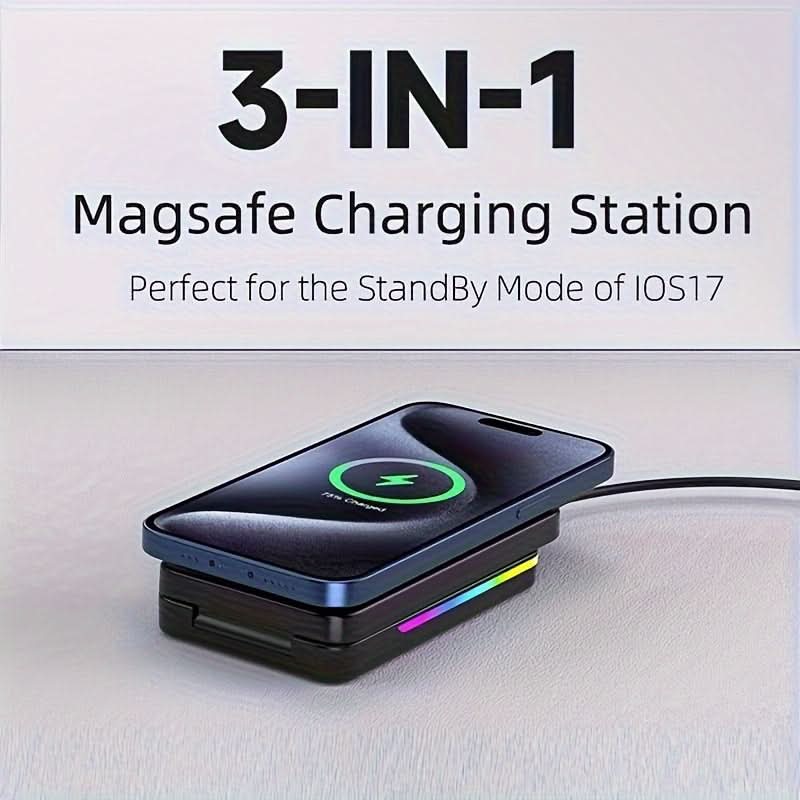 Simplify your charging routine with this 3-in-1 Foldable MagSafe Wireless Charging Station, perfect for iPhone 15 Pro Max, 14, 13, 12, Apple Watch, and AirPods. Designed for Apple enthusiasts, this sleek station offers fast, reliable charging with magnetic alignment for a secure hold, ensuring efficient power delivery for each device. The foldable design makes it compact and travel-friendly, ideal for nightstands or on-the-go use. Its versatile USB connection and compatibility with standard US plugs make setup easy, whether at home or while traveling. Keep your devices neatly organized and fully charged with this convenient, all-in-one charger—no more tangled cables or cluttered spaces.