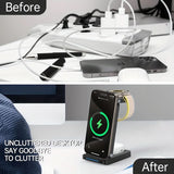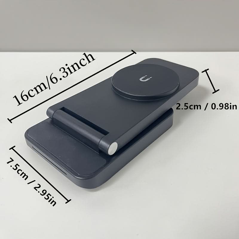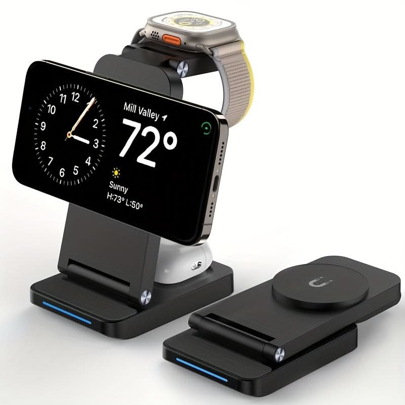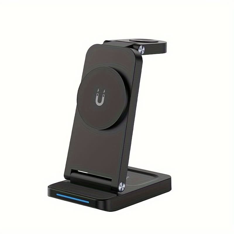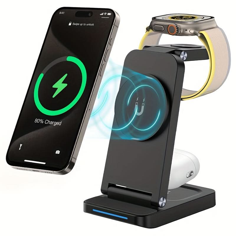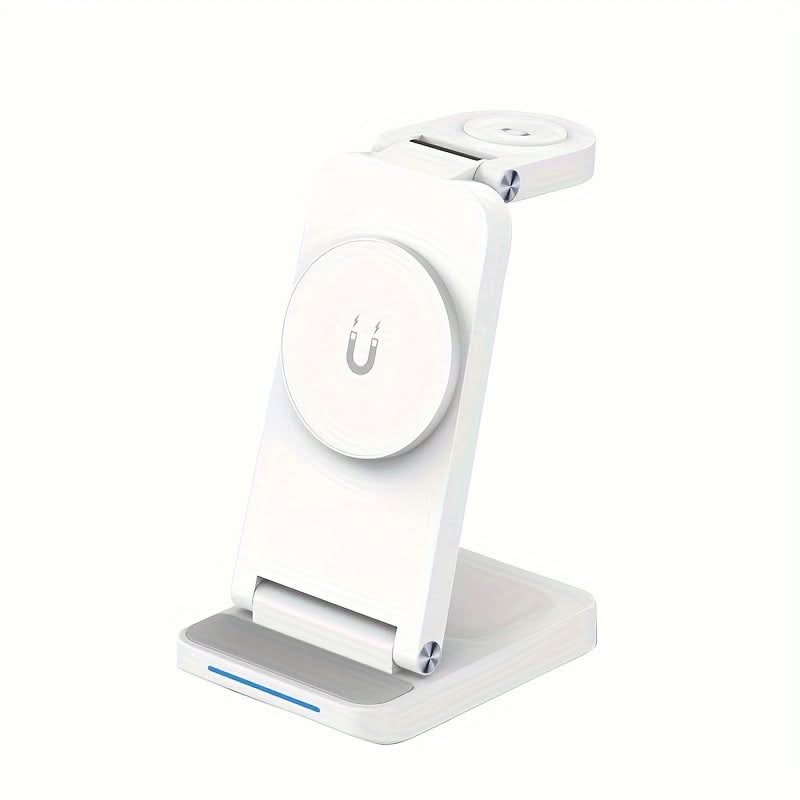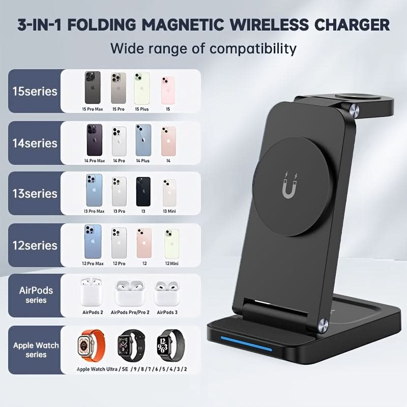 Keep your devices charged and organized with the 3-in-1 Magnetic Foldable Wireless Charging Station. This sleek, USB-powered charger delivers fast and efficient power for your iPhone 16/15/14/13/12 Pro Max, Apple Watch Series 9/8/7/6/5, and Air Pods. With a 36V max output, it ensures quick charging without the mess of cords. The foldable design makes it portable and space-saving, perfect for home or travel use. Made from durable ABS material, this charger combines reliability with a modern, minimalistic look. Its magnetic features keep your devices securely in place while charging, so you can enjoy a hassle-free experience. Ideal for those who need a convenient, all-in-one solution for their Apple ecosystem. Stay powered up with ease, wherever you go!