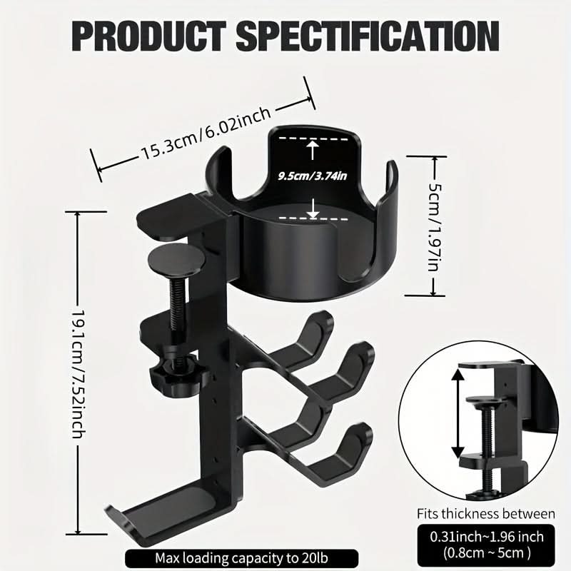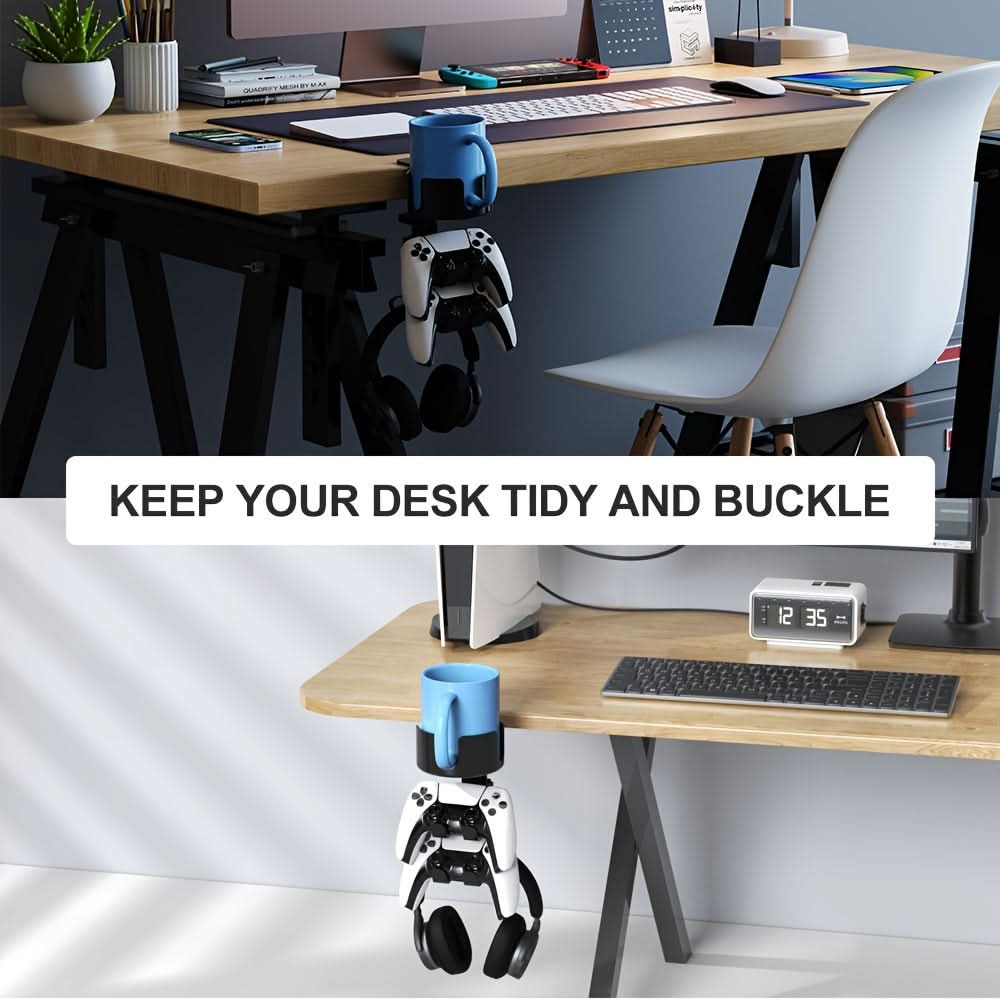 Maximize your desk space with the 3-in-1 Under Desk Clamp Headphone Stand. This all-in-one organizer features a rotatable headphone hook, a convenient cup holder, and a controller display, allowing you to keep your essentials neatly arranged and easily accessible. Made from durable metal, it offers a sleek, sturdy design that complements any workspace.