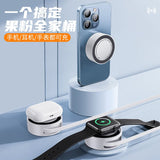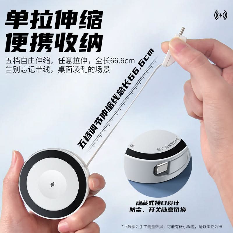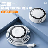 Simplify your charging routine with the 3-in-1 Wireless Charging Stand featuring a retractable cable for added convenience. Designed for MagSafe-compatible devices, this multi-functional charger powers up your smartphone, smartwatch, and earbuds simultaneously, eliminating clutter and tangled wires. The fast-charging capability ensures a quick and efficient charge, while the compact, portable design makes it perfect for home, office, or travel use. Crafted from durable plastic in a sleek white finish, this wireless charging stand blends seamlessly with any setup. Ideal for those seeking a space-saving, all-in-one charging solution, it’s compatible with various devices, ensuring a hassle-free and efficient power-up experience every time.