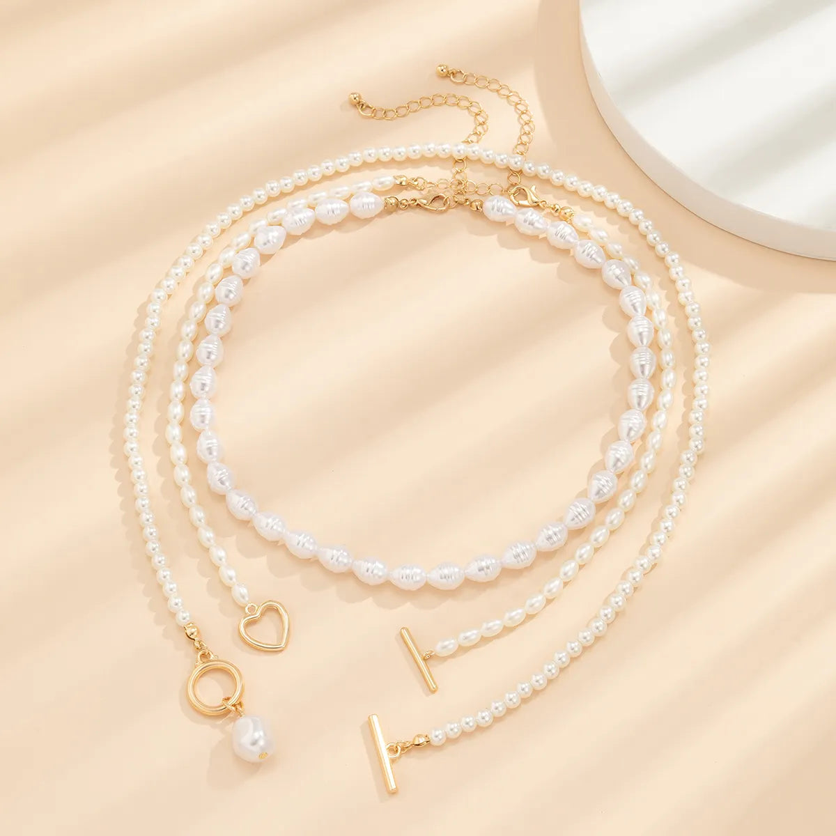 Elegant and effortlessly chic, this 3-Layer Pearl Necklace Set blends French retro charm with modern detailing. Featuring three distinct strands of imitation pearls—including rice-shaped and round pearls—each layer is finished with stylish gold toggle clasps, one of which is delicately shaped like a heart.