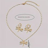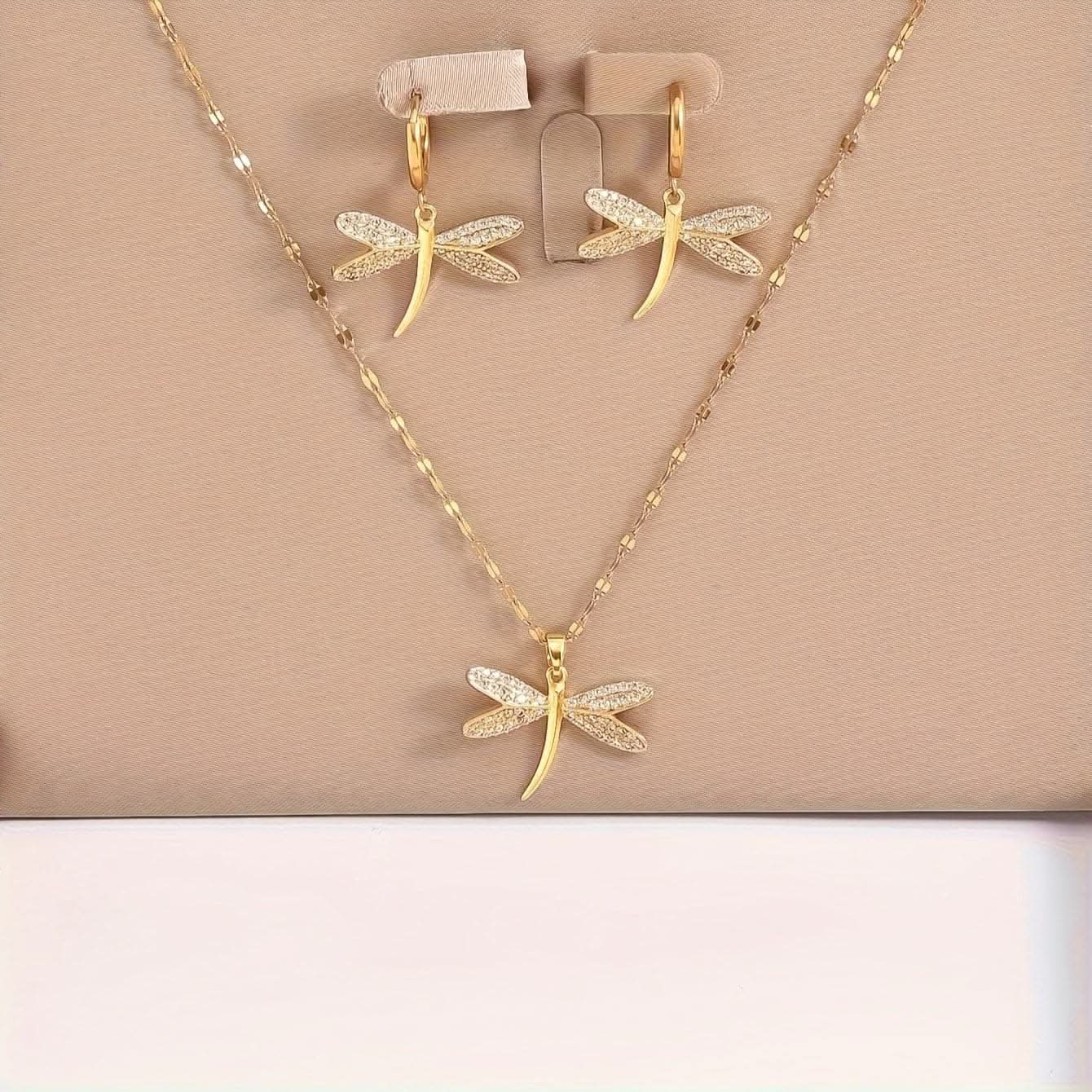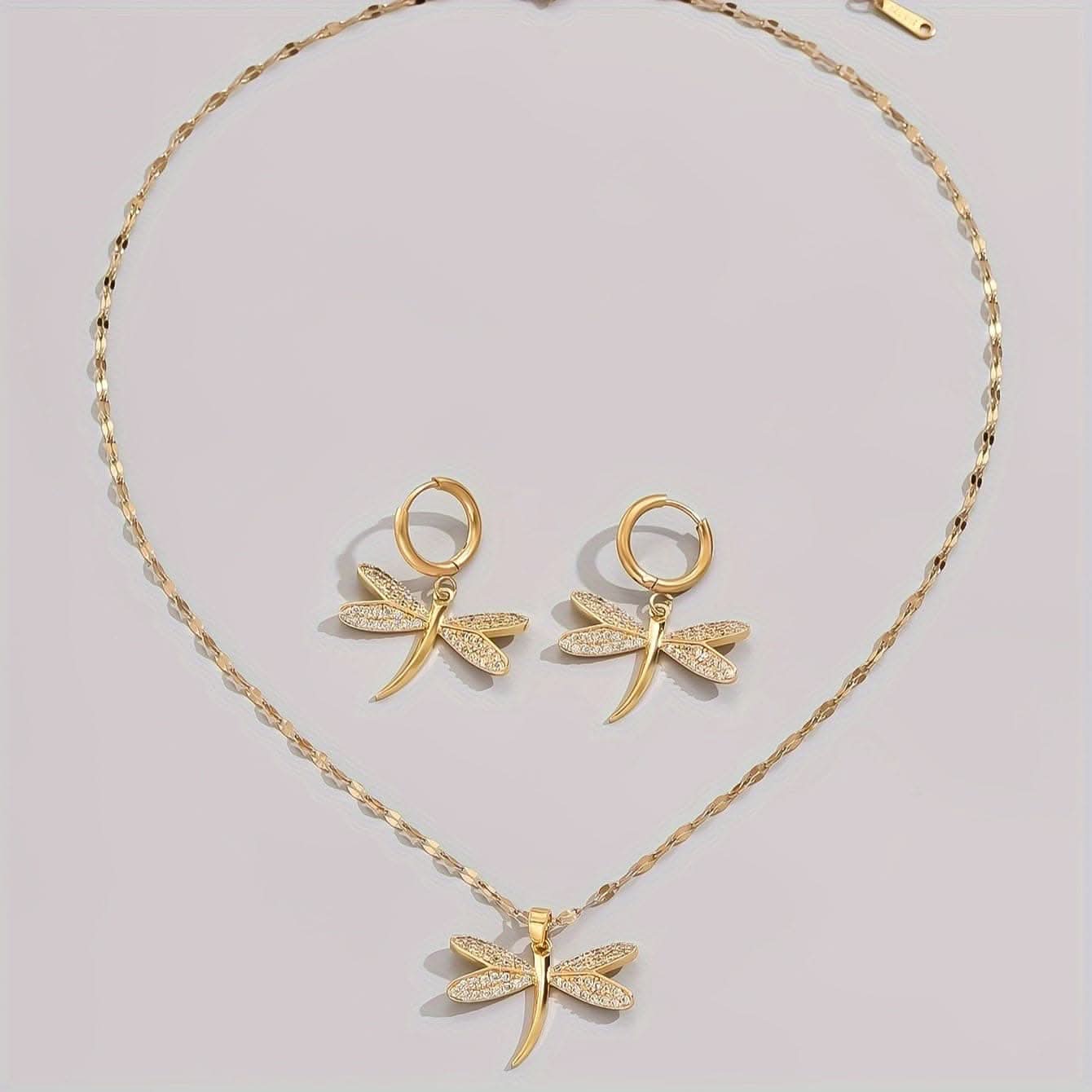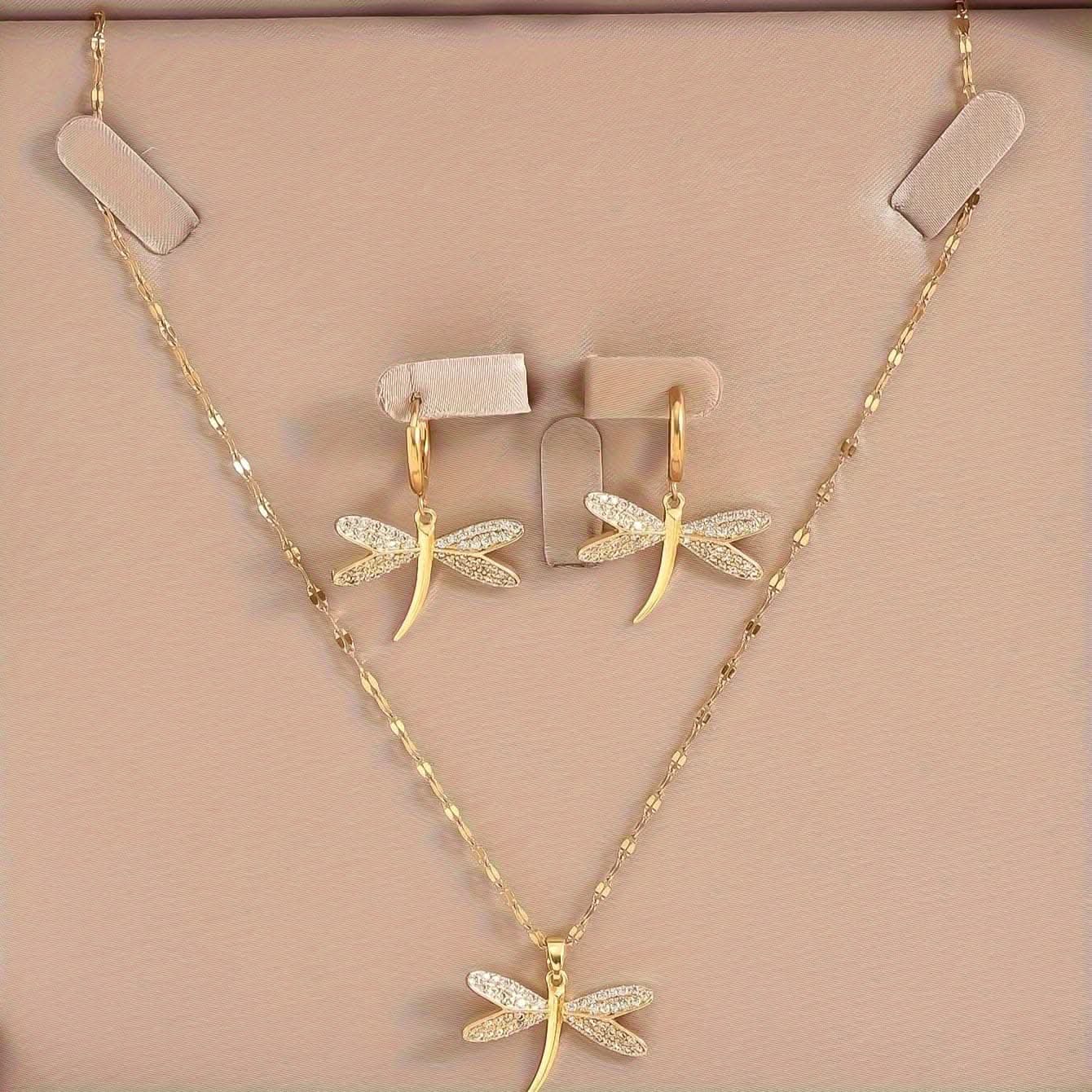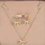 This luxurious 3-piece set includes a golden dragonfly pendant necklace and matching earrings, adorned with shiny rhinestone accents. Featuring a simple yet trendy design, it's suitable for both men and women and perfect for casual or party wear. An ideal gift for friends and family.