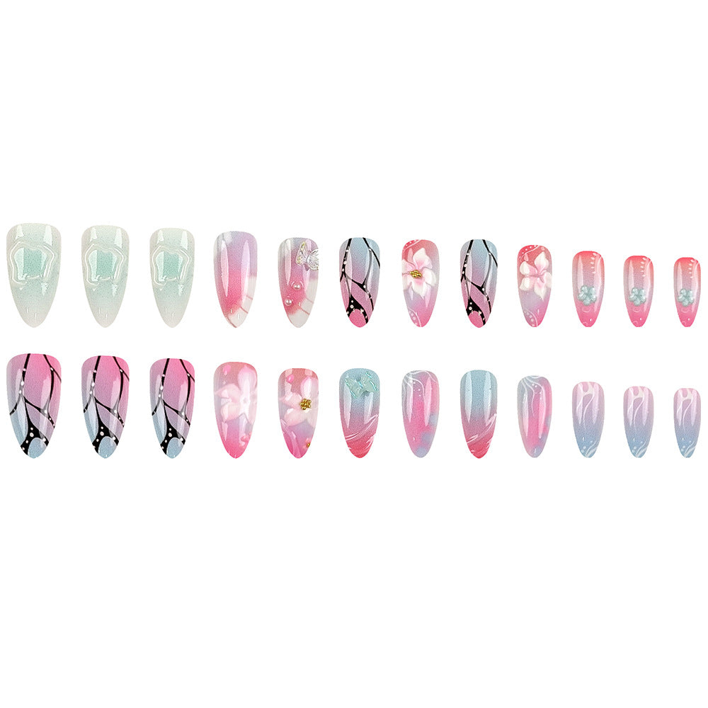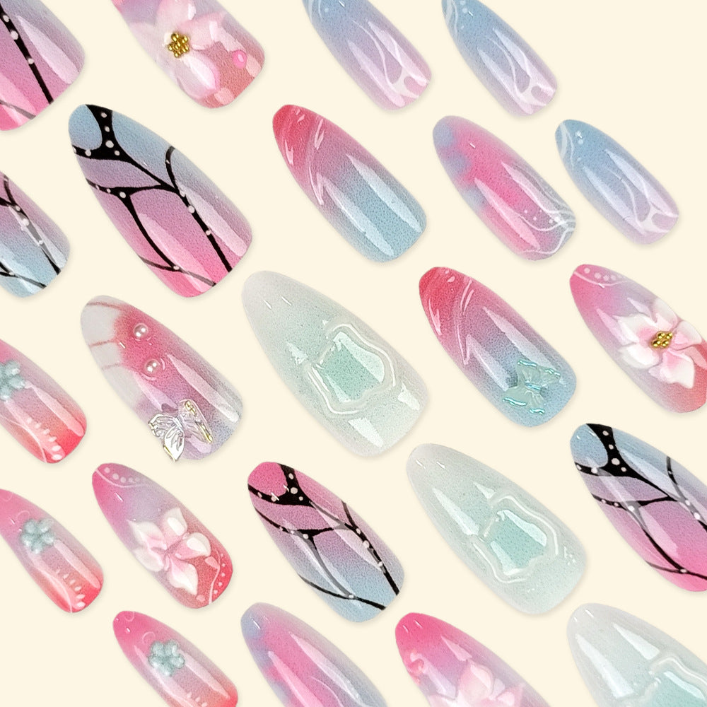 Bring a touch of creativity to your nails with these 3D press-on nails featuring delicate butterflies and floral accents. This 24-piece set comes in soft pink, blue, and white shades, offering a versatile and artistic look that works for both everyday wear and special occasions. The medium almond shape creates an elegant silhouette, while the detailed relief design adds depth and dimension for a truly eye-catching finish. Made from durable acrylic, these nails are lightweight, comfortable, and easy to apply with glue for a secure, salon-style manicure at home. Perfect for weddings, parties, or simply adding flair to your daily style, they offer beauty without the salon price. Sourced from Worldwide Suppliers, this set brings global nail art trends to your fingertips with effortless charm.