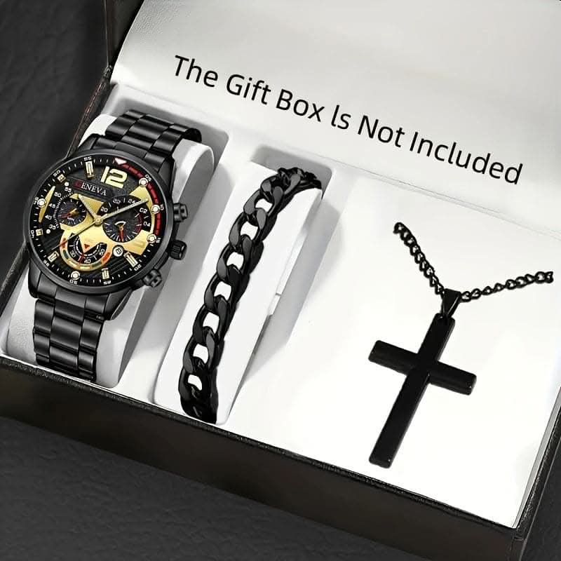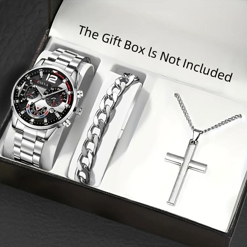 Elevate your style with this 3-piece set, featuring a sleek stainless steel calendar watch, a matching silvery bracelet, and a cross pendant necklace. Ideal for adding a touch of sophistication to any business outfit.