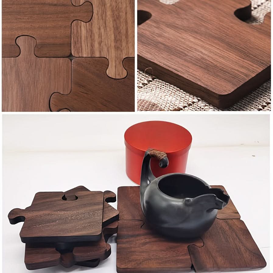 Protect your surfaces in style with this 4-piece walnut wooden puzzle coaster set. Crafted from high-quality solid wood, these durable, heat-resistant drink mats provide excellent protection against spills, stains, and heat damage. Their unique interlocking puzzle design allows you to use them individually or connect them to create a larger surface for teapots, coffee carafes, or serving dishes.