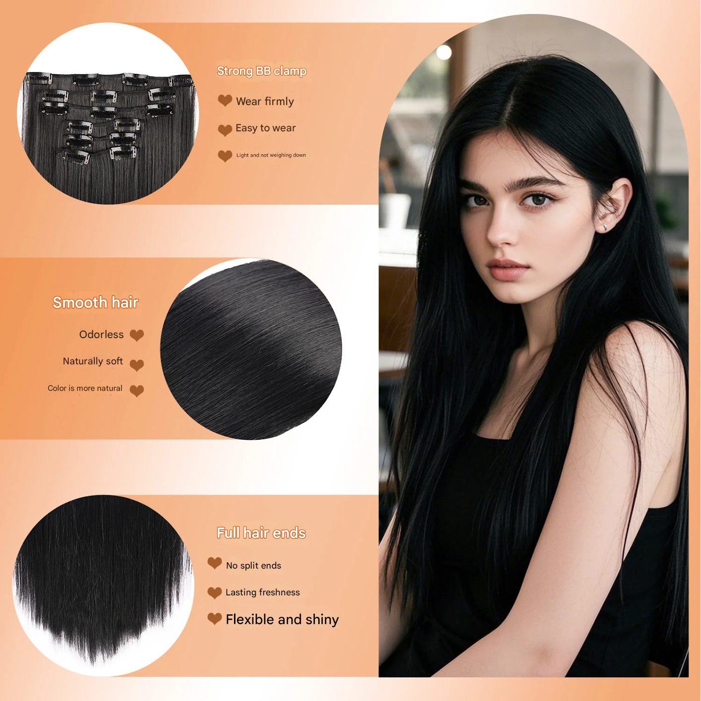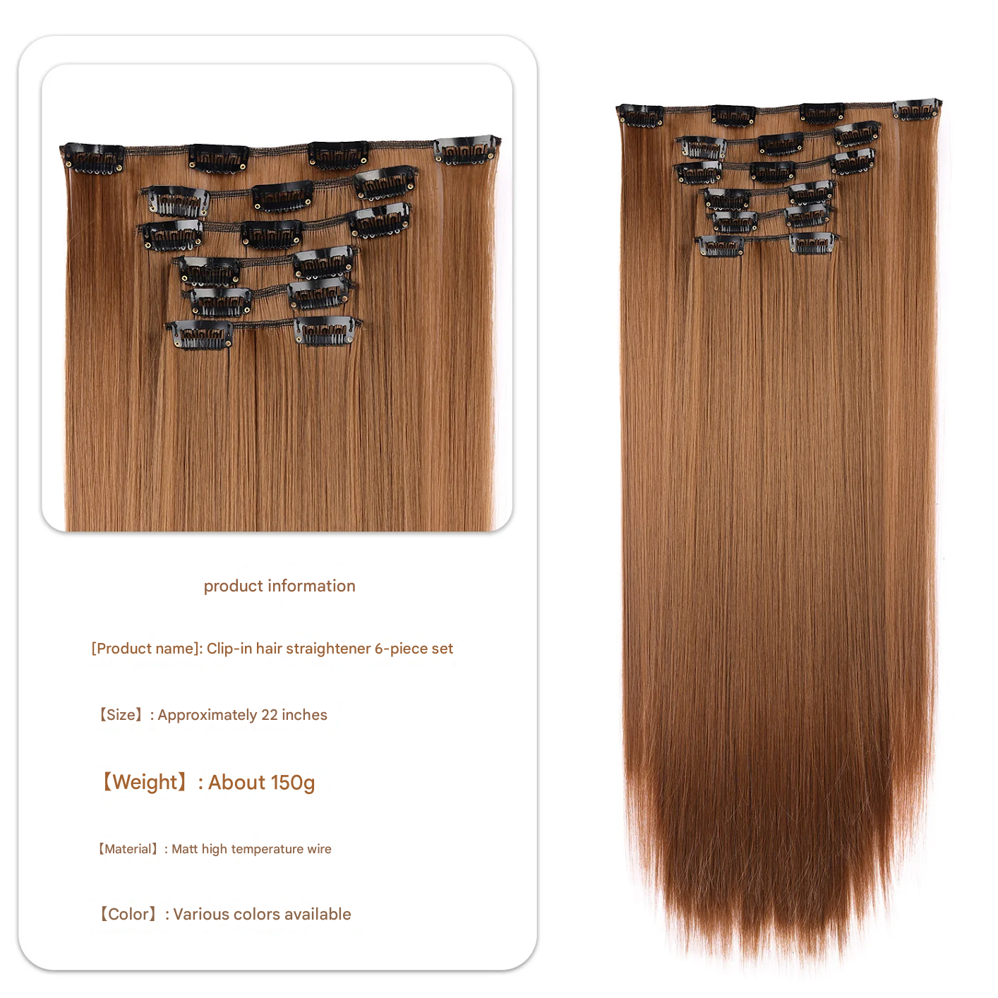 Upgrade your hairstyle in minutes with this premium 6-piece clip-in straight hair extension set, designed for effortless volume and length. Crafted from soft synthetic fiber, these sleek, 22-inch extensions provide a smooth, natural look that blends seamlessly with your own hair. The easy-to-use clips ensure a secure hold without damaging your scalp or natural strands, making them perfect for both daily wear and special occasions. Whether you're looking to enhance your style or try something new, this lightweight set offers flexibility and comfort all day long. Sourced from Worldwide Suppliers, it's a salon-worthy solution at your fingertips. Ideal for any face shape or skin tone, this hair extension set is a must-have for beauty lovers who want quick transformations without the commitment.