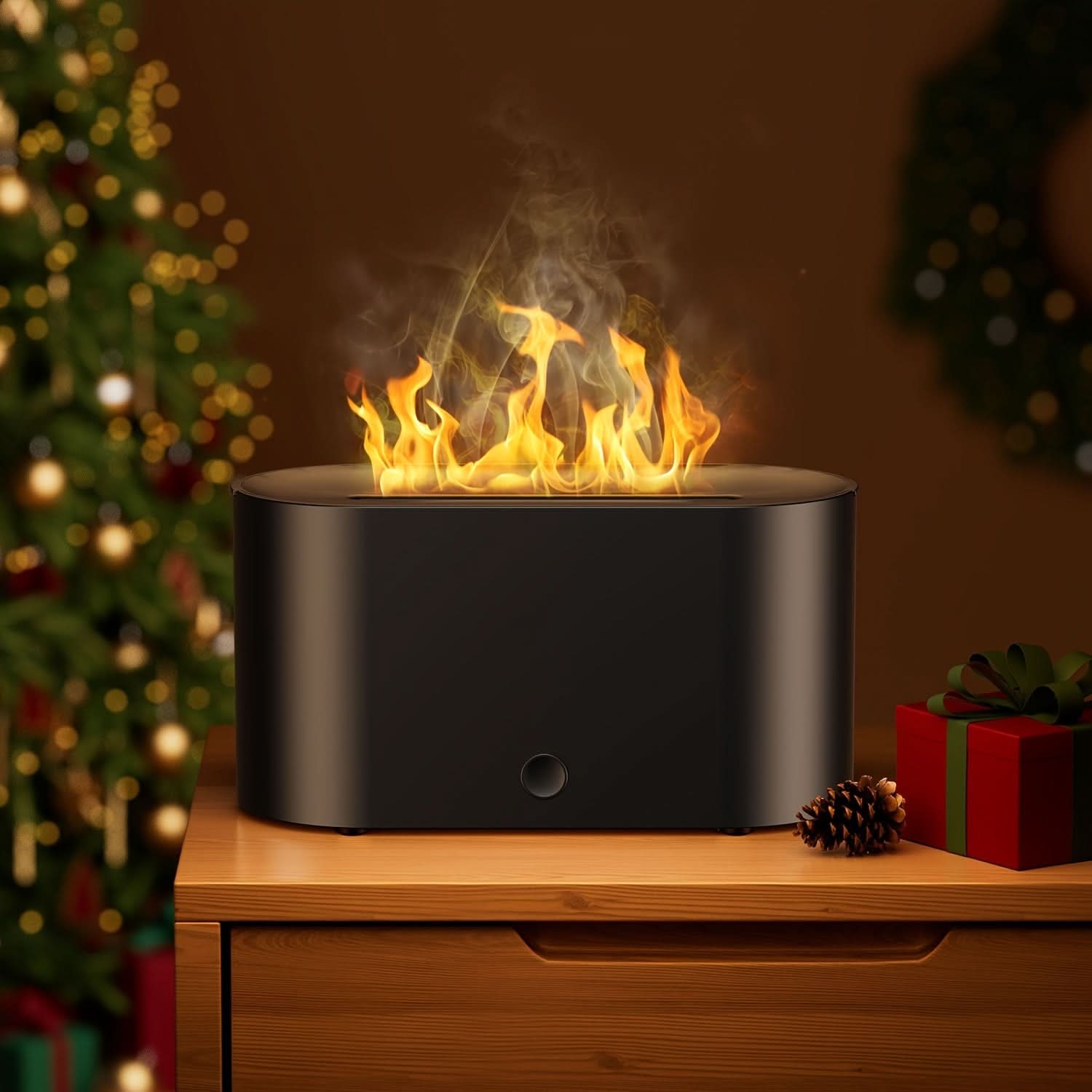 Enhance your space with this 7-color simulated flame humidifier, designed to mimic the soothing ambiance of a flickering flame. Perfect for home, office, or as a unique gift, this aromatherapy machine doubles as a stylish nightlight and air purifier. It can be used with essential oils to create a calming atmosphere, improving air quality and adding a pleasant scent to any room.