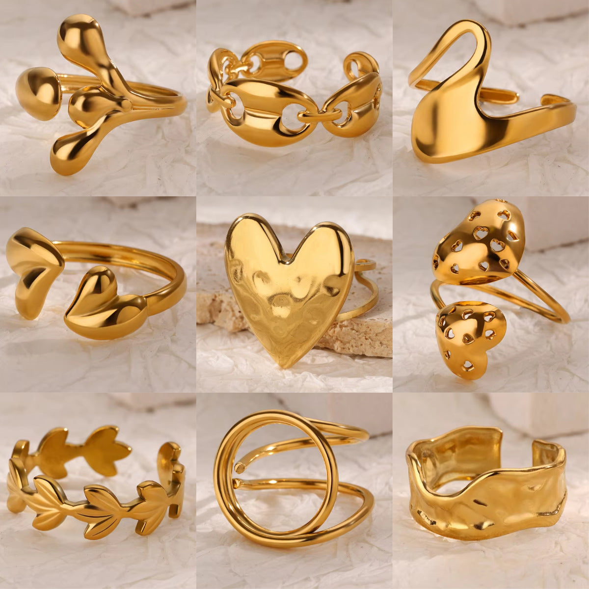 Discover the perfect blend of elegance and versatility with this set of 9 adjustable gold stainless steel rings. Featuring chic heart, U, and geometric shapes, each ring boasts a smooth, non-fading finish that ensures long-lasting shine and durability. Designed with an open band style, these lightweight, elegant minimalist rings fit comfortably on any finger size, making them perfect for everyday wear or special occasions. Handpicked from Abroad, this collection is a testament to high-quality craftsmanship and timeless design. Whether worn alone or stacked for a bold statement, these rings effortlessly elevate any outfit with a touch of sophistication. Ideal for women seeking both style and durability, this set is a must-have addition to your jewelry collection.