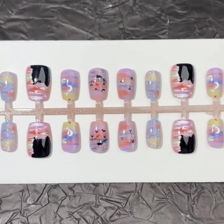 Bring a touch of art to your nails with these Artistic Sunset Cat Press-On Nails. Featuring a unique oil painting-inspired design with pastel shades of pink, purple, blue, and orange, each nail showcases a whimsical landscape with cats, moons, birds, and sunsets in a soft gradient finish. Perfectly shaped in short ovals, these acrylic press-on nails are easy to apply and remove, delivering salon-quality style without the hassle. Lightweight yet durable, they are designed for comfort and long-lasting wear. Sourced from Worldwide Suppliers, this collection merges international creativity with everyday convenience, allowing you to express your artistic side effortlessly. Ideal for casual wear, special occasions, or gifting, these nails offer a chic and imaginative way to elevate your manicure game.