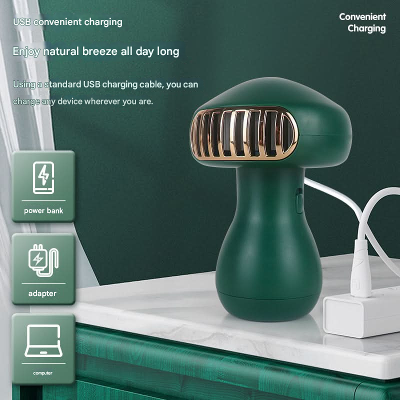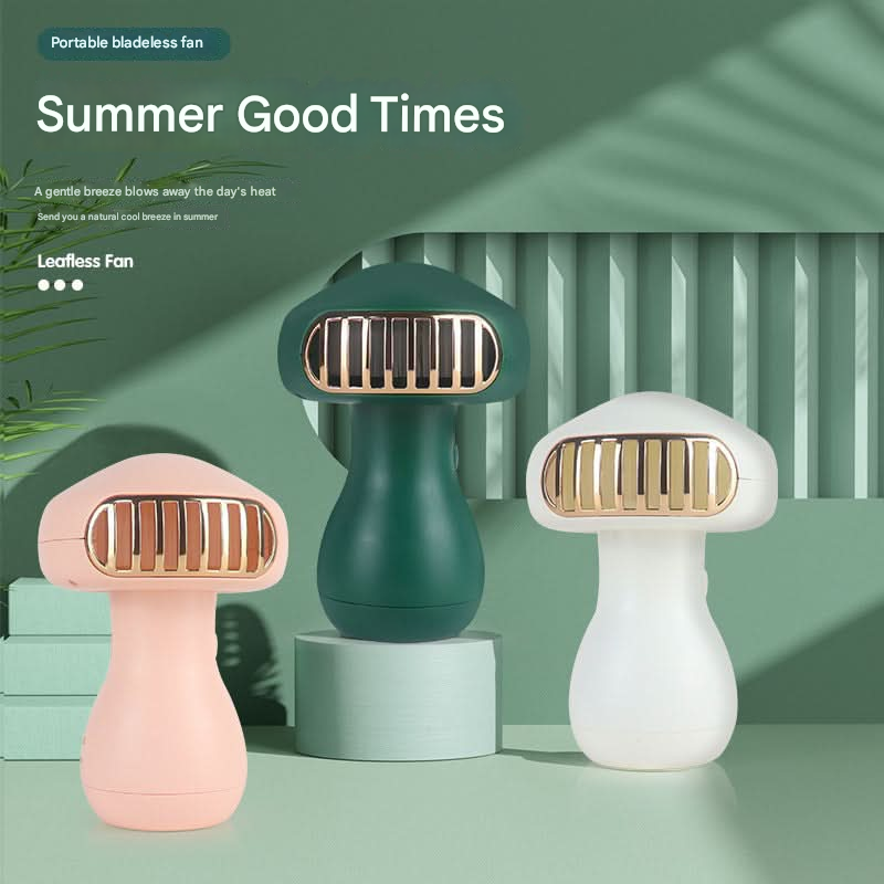 Enjoy a powerful, bladeless breeze with this stylish mushroom-shaped mini fan, designed for ultimate comfort and convenience. Perfect for students, office workers, and travelers, this USB rechargeable fan delivers a safe, quiet, and energy-efficient cooling experience without exposed blades—making it ideal for kids and pets.