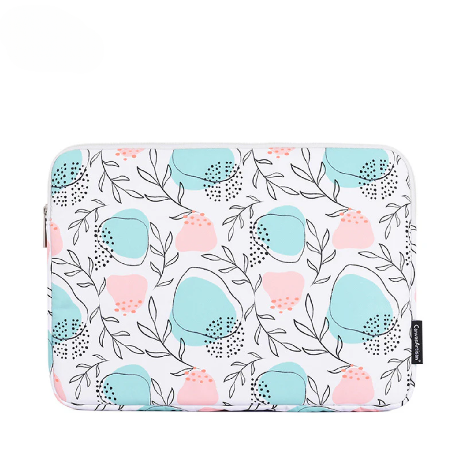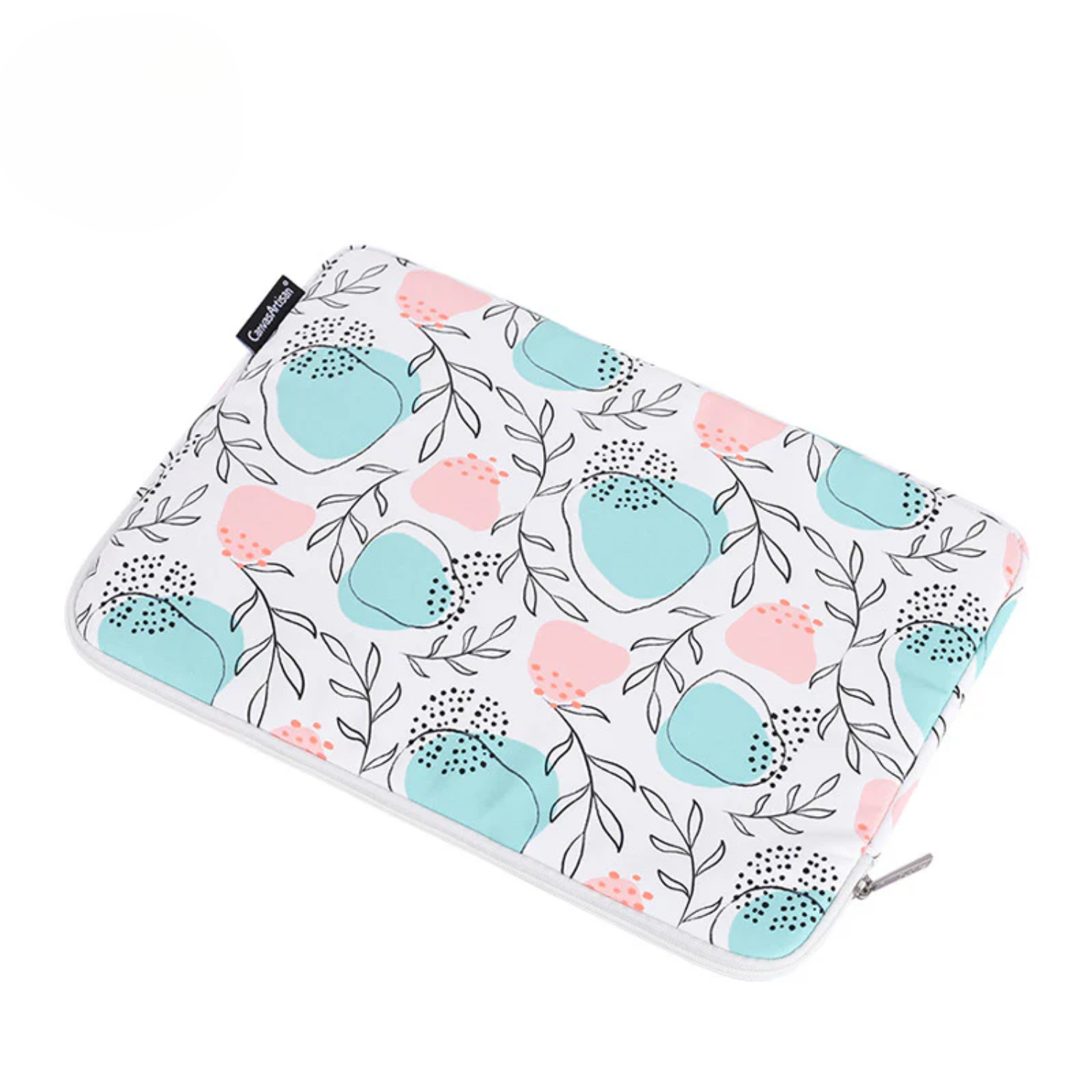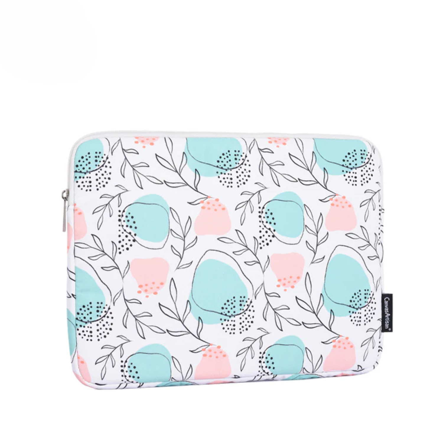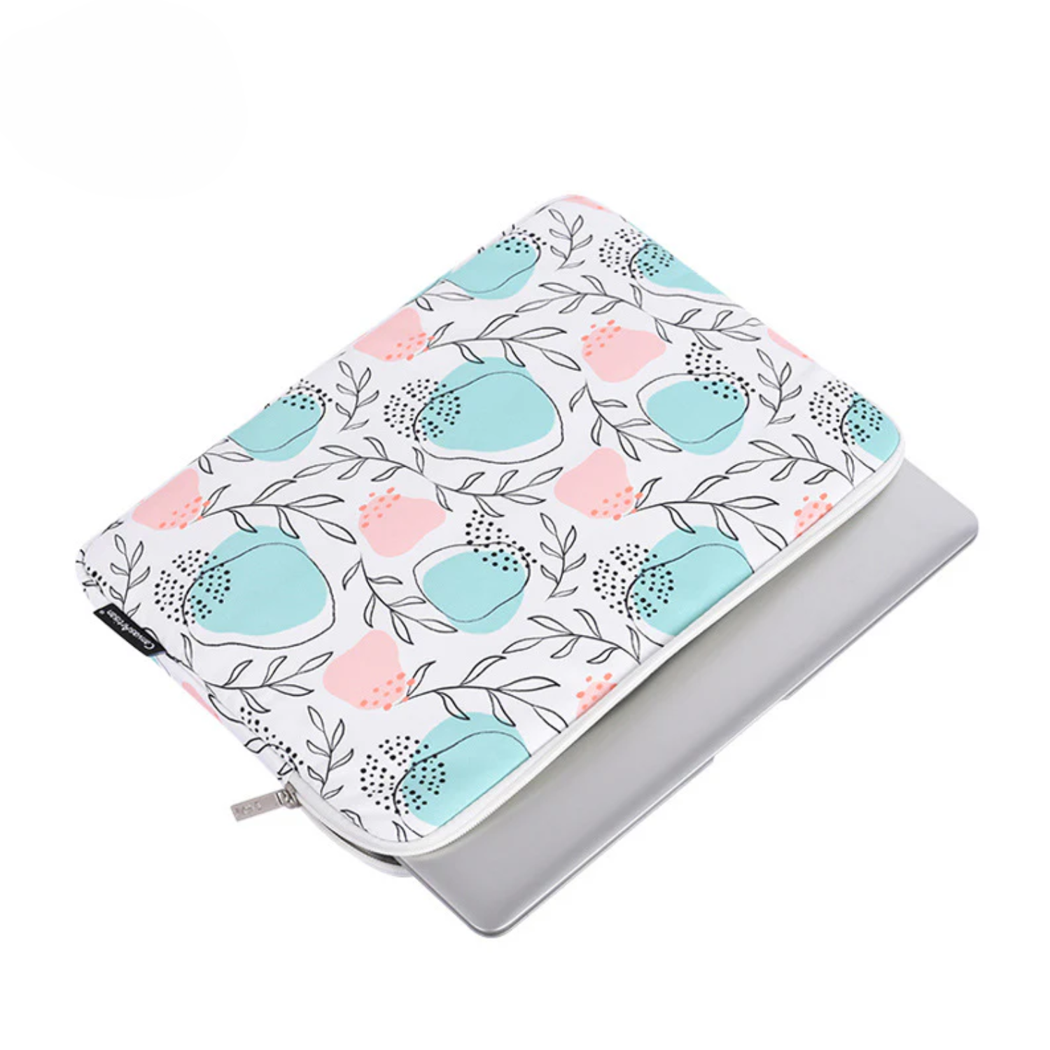 Its soft interior cushions your device, while the breathable, lightweight design slips easily into backpacks or totes. The abstract floral print features a white base with mint green, blush pink, and black accents—perfect for those who want a subtle but stylish statement.