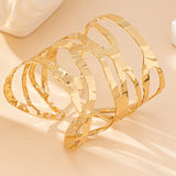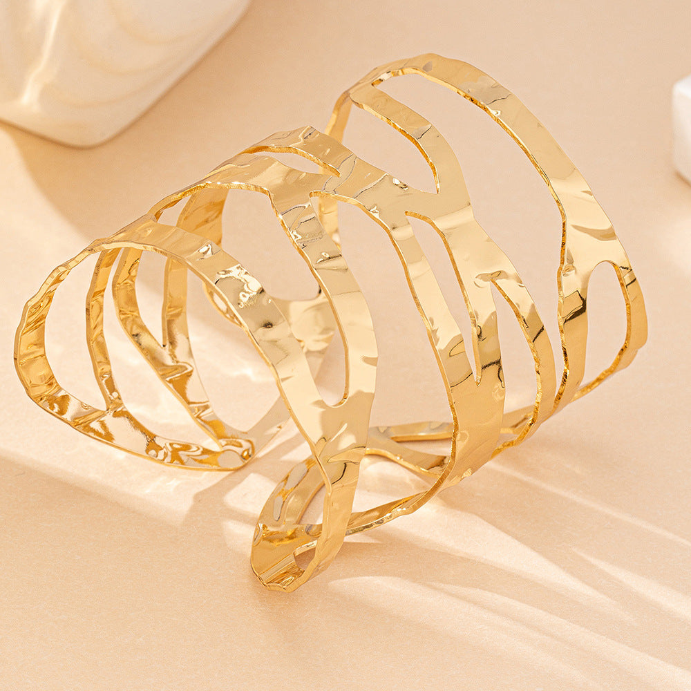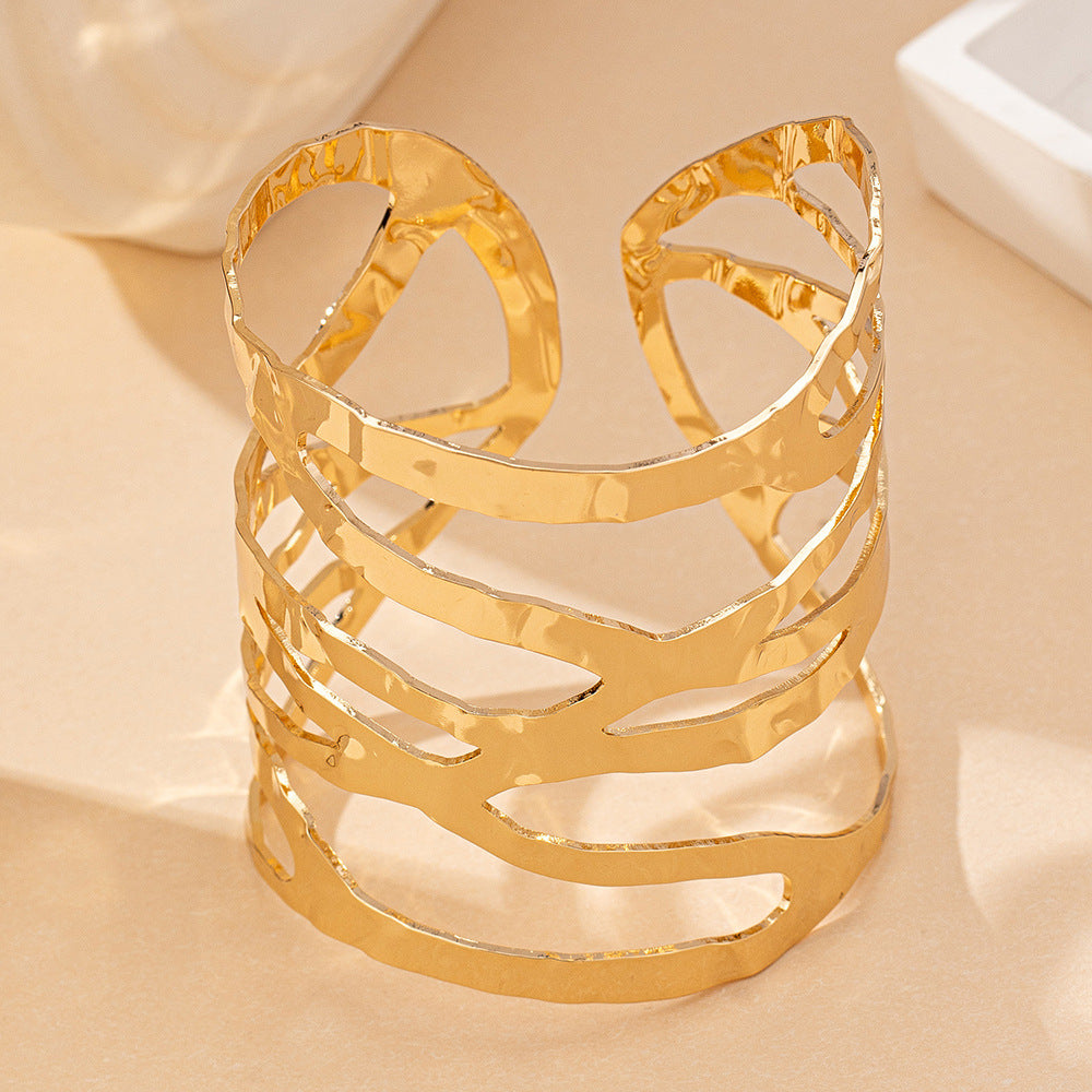 Elevate your accessory game with this bold gold cutout cuff bracelet, crafted from durable alloy for lasting shine and style. Featuring an abstract geometric design, this open bracelet adds a modern, artistic touch to any outfit. Its adjustable size ensures a comfortable fit for all wrist types, making it a versatile addition to your jewelry collection. Perfect for both casual and formal occasions, this statement piece effortlessly blends European and American fashion influences. Handpicked from Abroad, it combines quality craftsmanship with eye-catching design. Whether you're treating yourself or gifting a loved one, this cutout cuff bracelet is sure to impress. Add a touch of sophistication and contemporary flair to your look today!