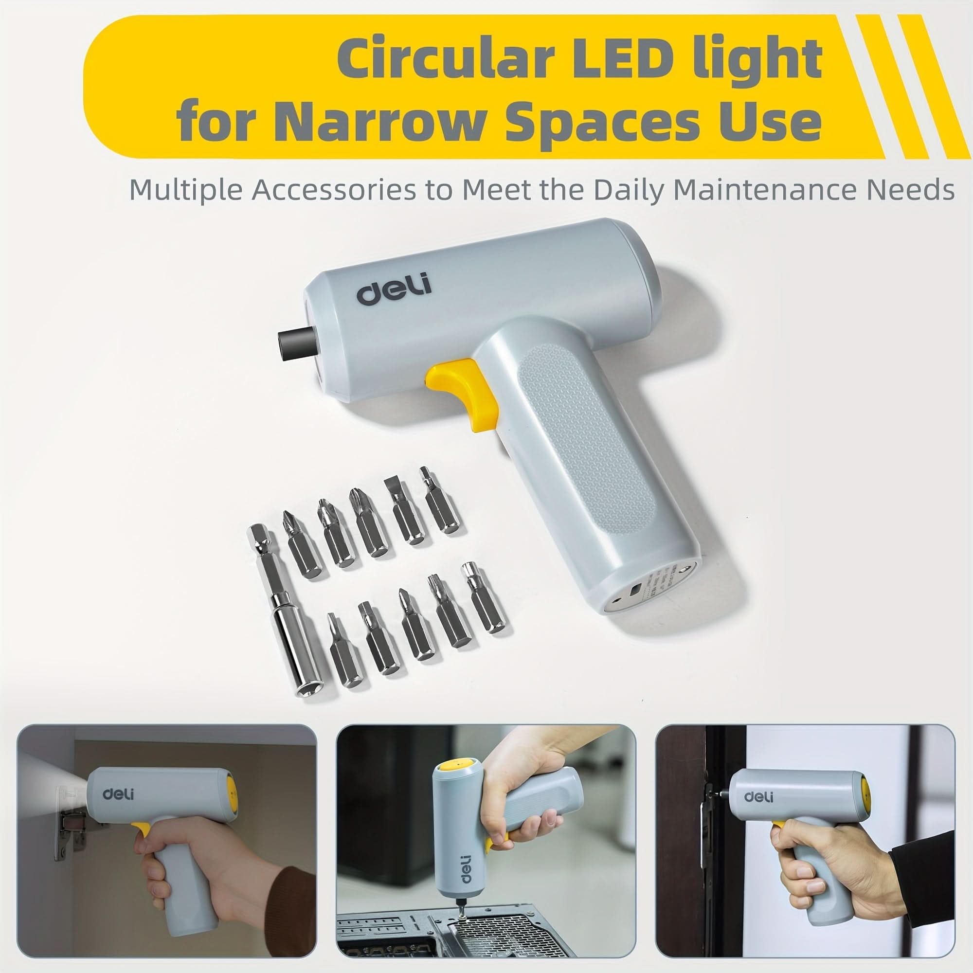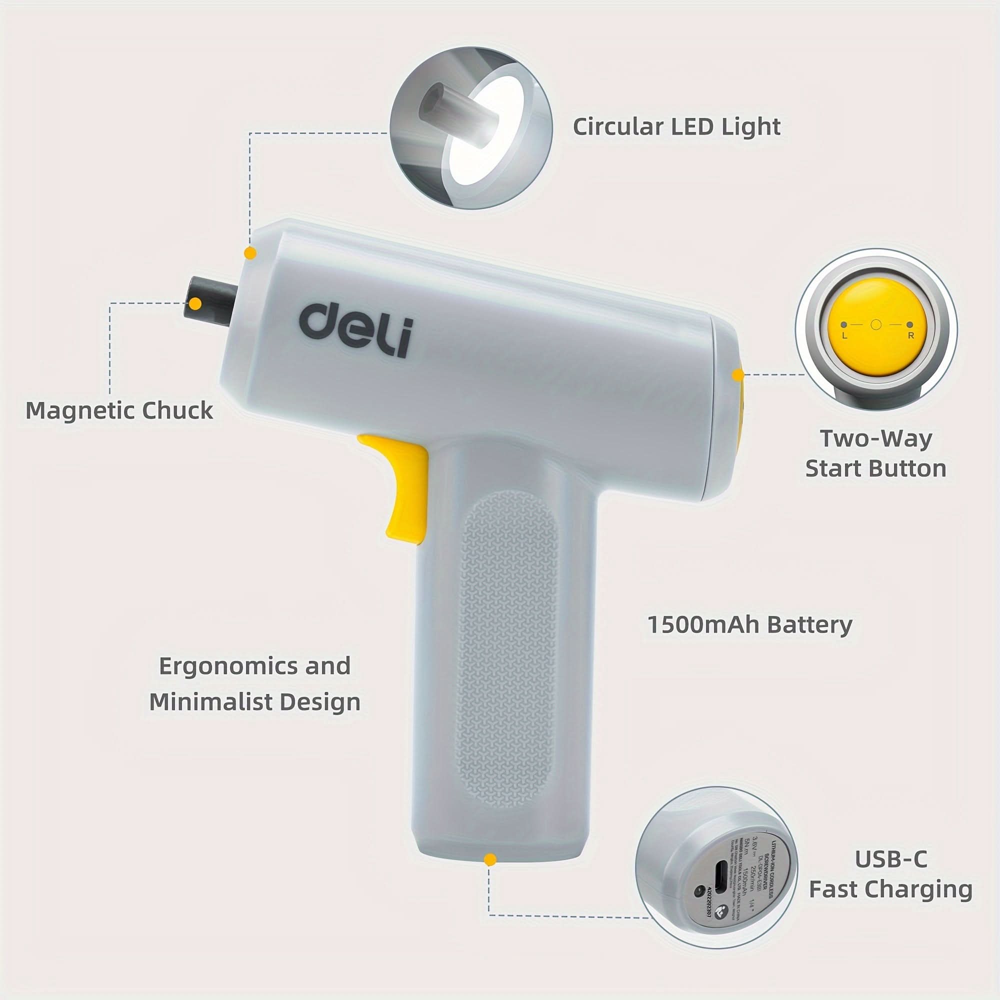 The Deli 12pcs Cordless Electric Screwdriver Kit is the perfect tool for DIY enthusiasts and professionals alike. Powered by a 3.6V lithium rechargeable battery, this portable, lightweight screwdriver (weighing only 0.75 lbs) provides convenience and power for all your projects.