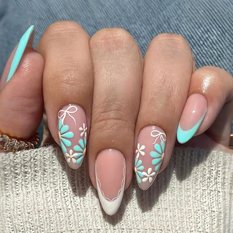 Add a touch of spring to your style with these Cute Floral Almond Press-On Nails. Designed in soft pastel shades of pink, mint, white, and yellow, each nail features delicate floral patterns with thin lines and playful bow accents for a fresh, feminine look. Crafted from high-quality acrylic gel, these medium almond nails are lightweight, durable, and easy to apply, giving you salon-worthy results in just minutes. Whether you’re dressing up for a date, a party, or simply want to brighten your everyday style, these nails provide the perfect balance of elegance and charm. Handpicked from Abroad, this collection captures international nail art trends and delivers them straight to your fingertips. With their versatile design and easy application, these floral press-on nails are an effortless way to showcase your personality while keeping your look stylish and fun.