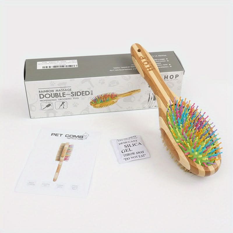 Keep your furry friend looking their best with the Dual-Sided Pet Grooming Comb Brush. Perfect for both dogs and cats, this versatile grooming tool features a dual-sided design for tackling shedding and detangling with ease. The soft TPU bristles gently remove loose fur, knots, and tangles without irritating your pet's sensitive skin.