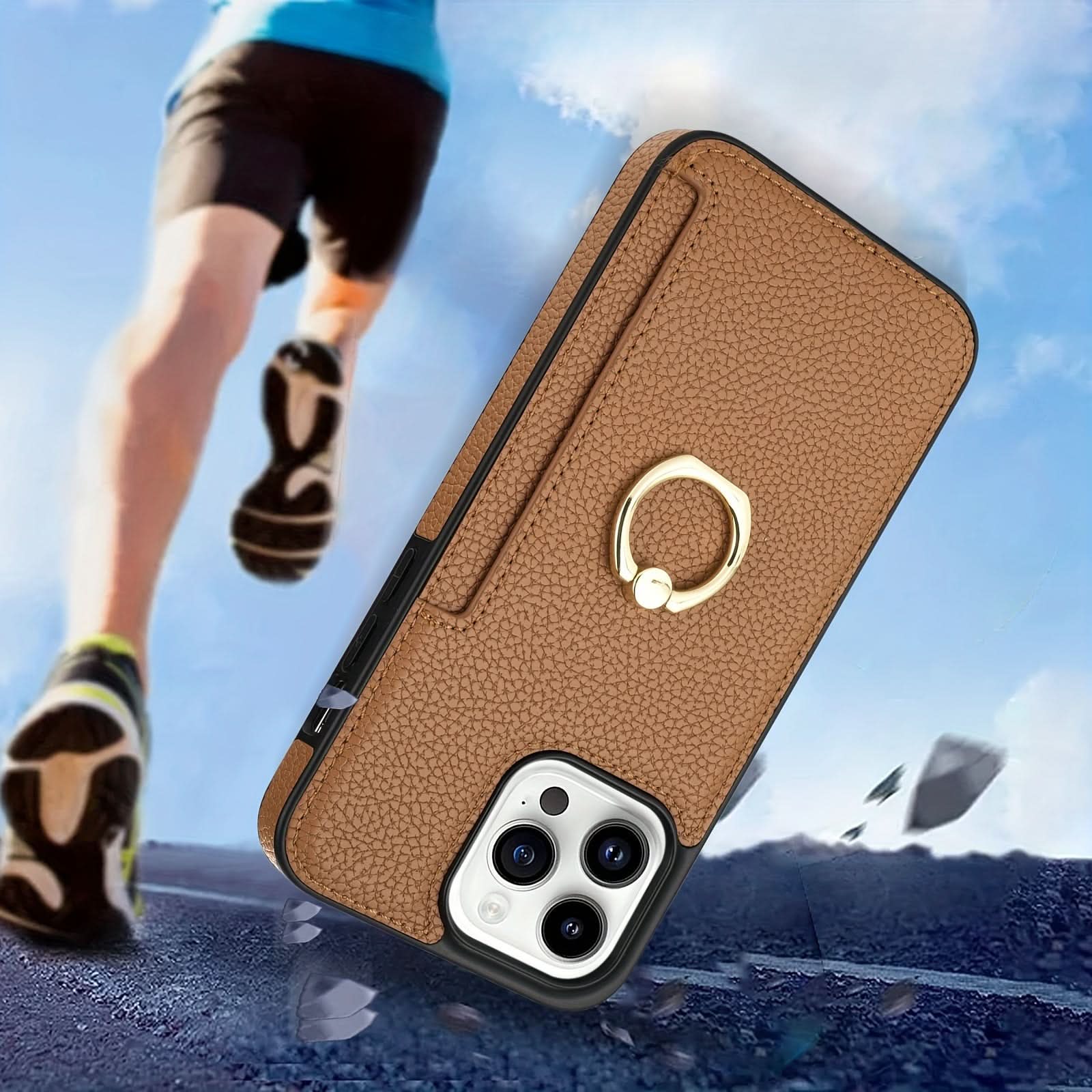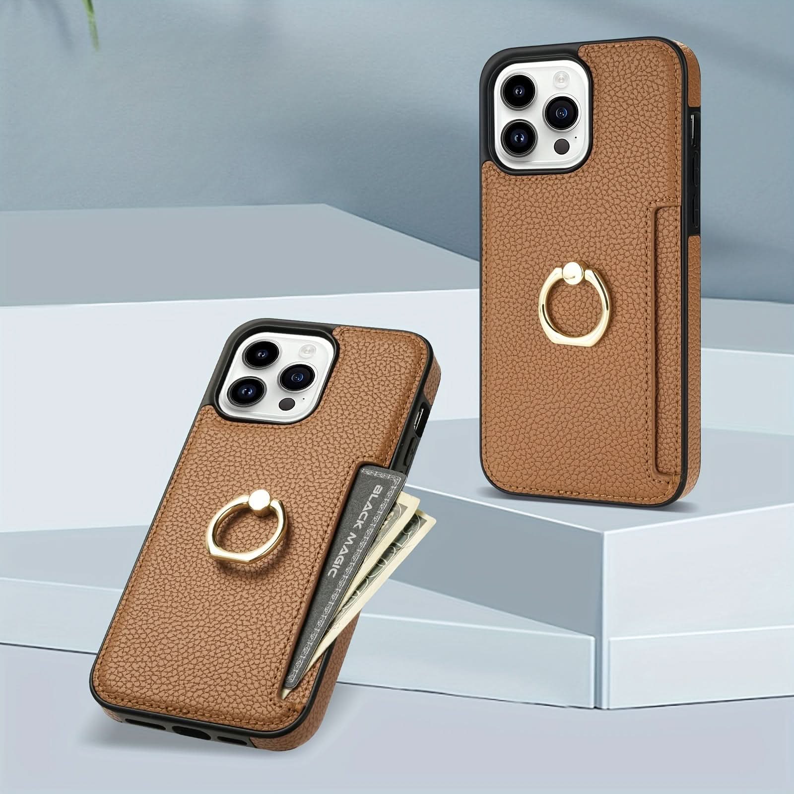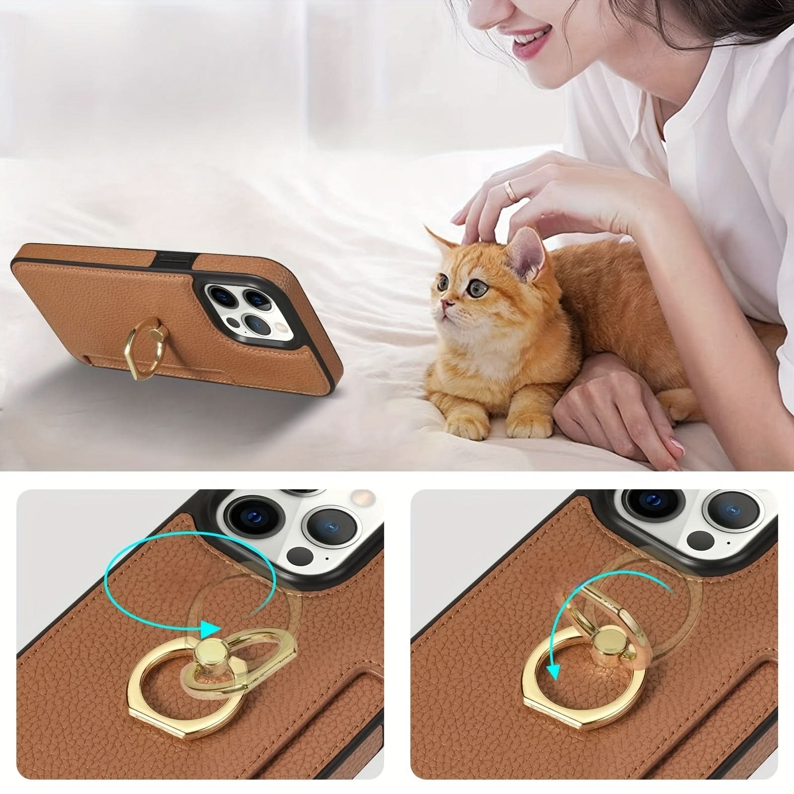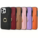 Elevate your phone’s style and functionality with this Faux Leather Card Holder Phone Case. Designed for convenience and elegance, this case features a built-in card slot, making it perfect for carrying your essentials like credit cards or IDs. The sleek faux leather material not only looks luxurious but also provides a non-slip grip for added security. The integrated finger ring buckle doubles as a secure grip and a convenient kickstand for hands-free viewing. With its durable design, this case offers reliable protection against daily wear and tear while keeping your phone slim and lightweight. Compatible with a wide range of iPhone models, including iPhone 15, 14, 13, and 12 series, this case is a practical and stylish accessory for any occasion. Whether you’re heading to the office or out for an evening, this versatile phone case has you covered.