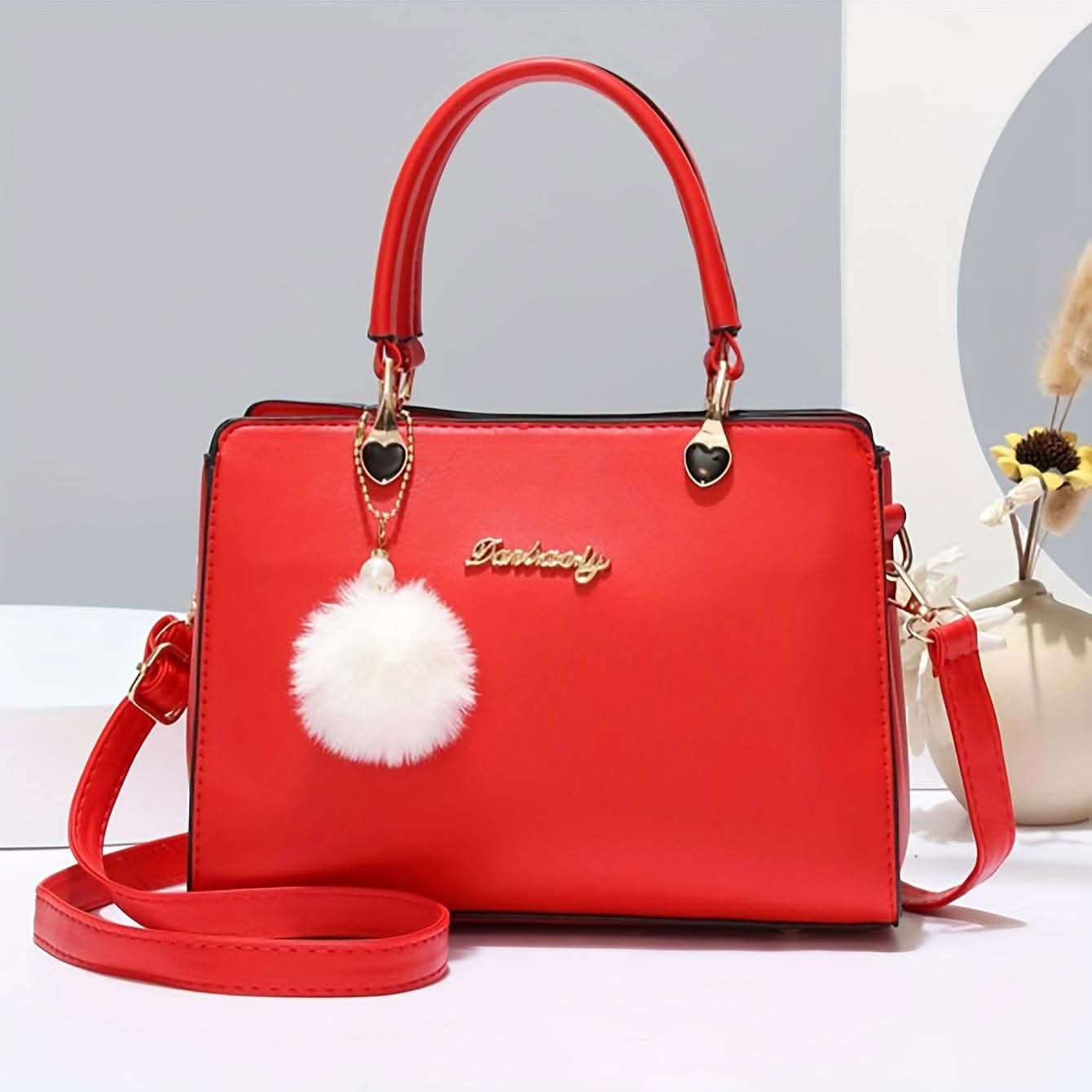 The Faux Leather Solid Color Satchel Handbag features a removable strap and zipper closure, with a multi-layer crossbody design for versatile use. Equipped with a polyester lining, fade-resistant material, and charming pompom ball accents, it’s perfect for adding a stylish touch to occasional outings.