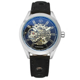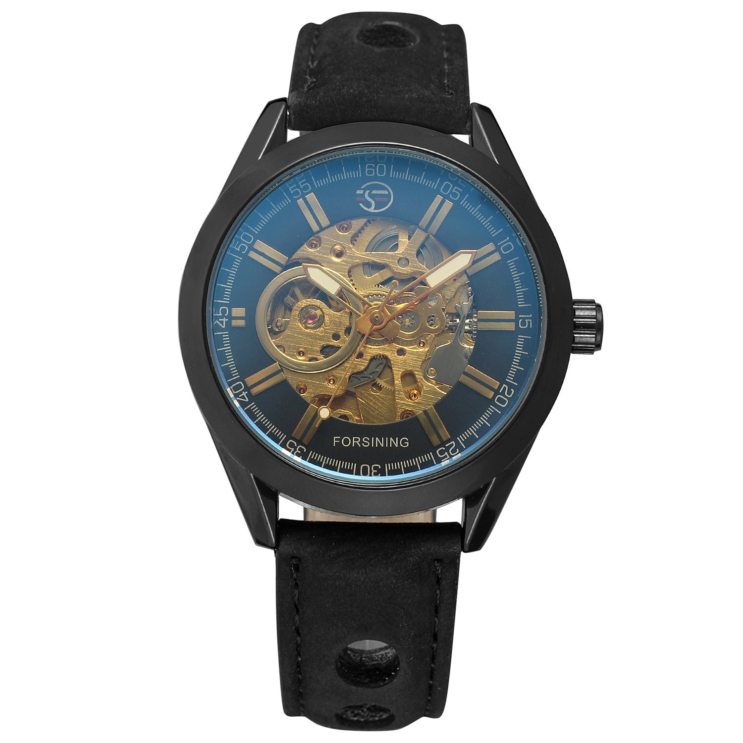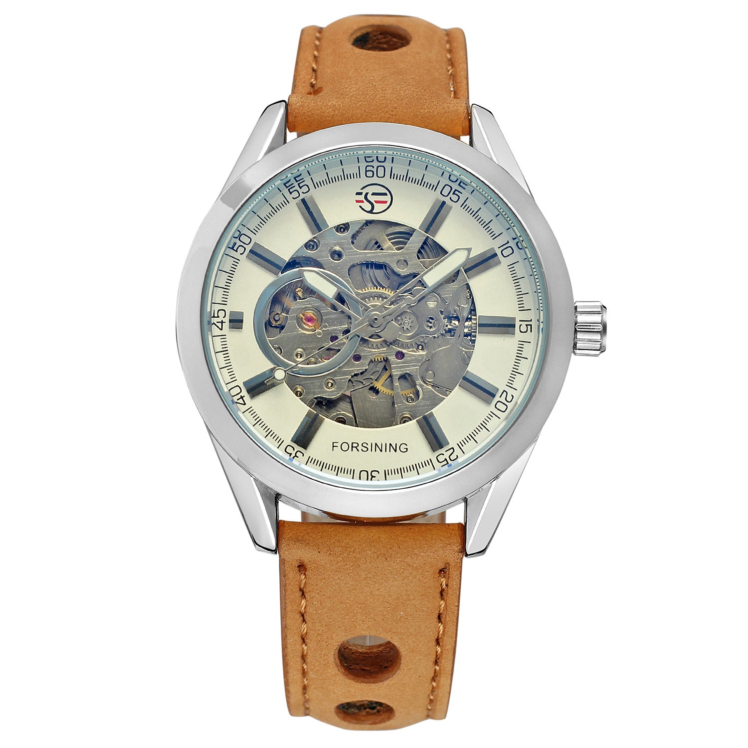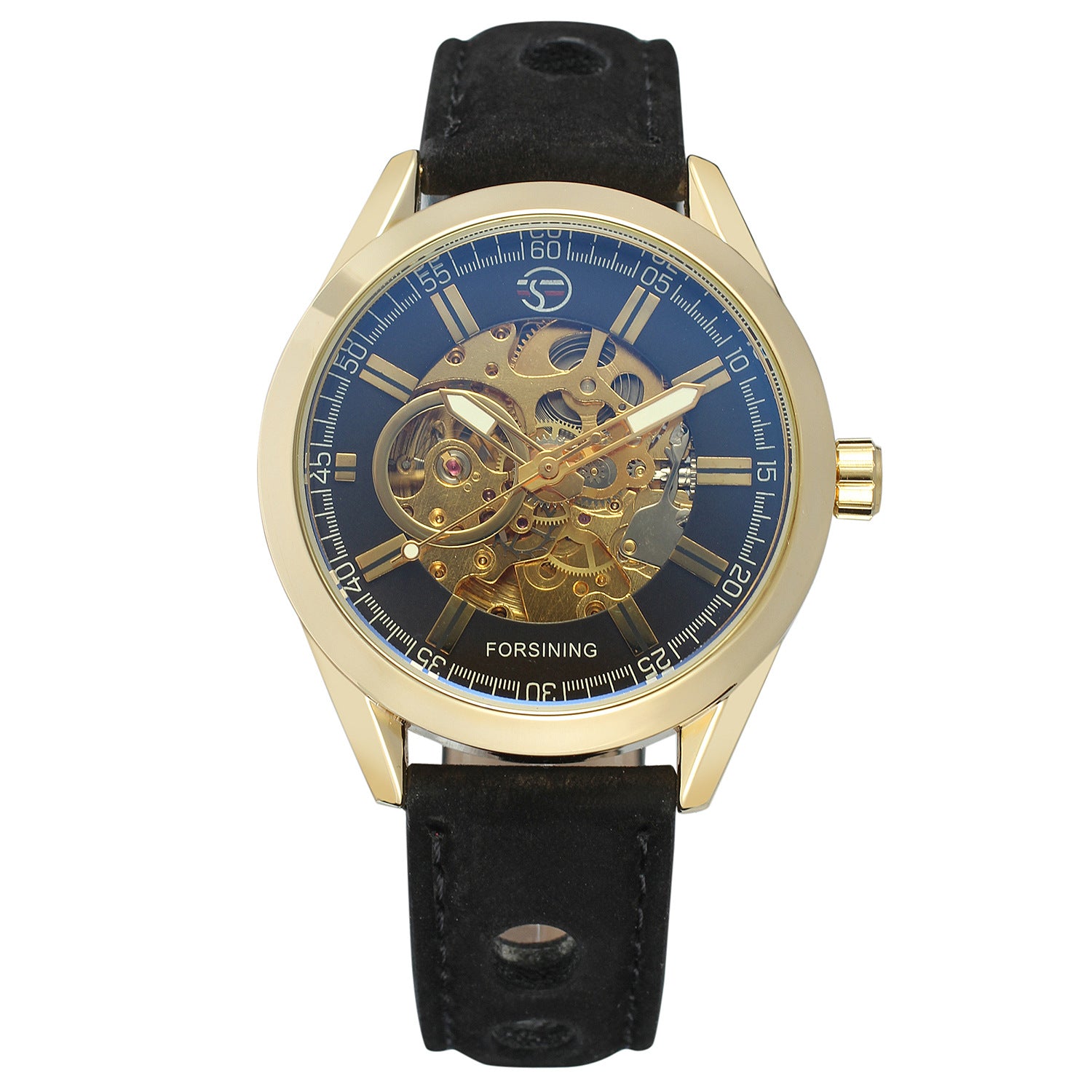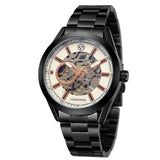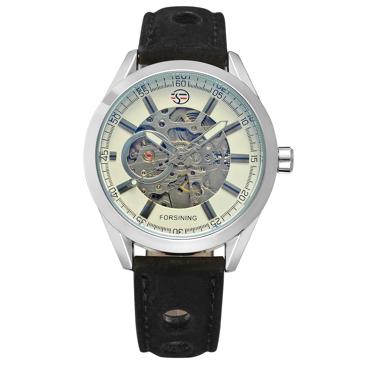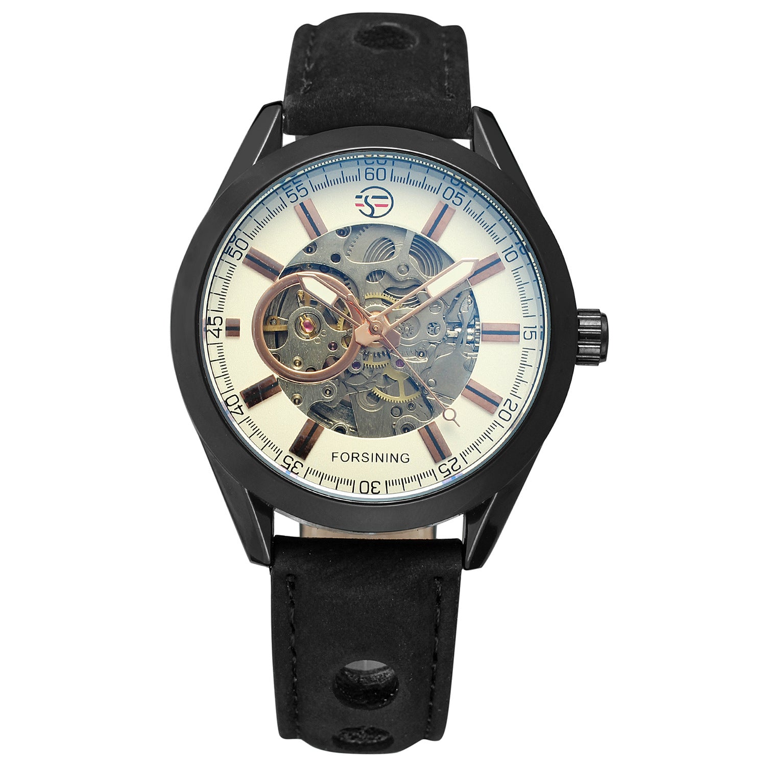 Stand out with this hollow dial mechanical watch, designed for those who appreciate style with substance. With a bold 42.5mm alloy case and mineral reinforced glass, this watch features bar nail scale markers and a transparent face that reveals its intricate mechanical movement—no batteries needed.