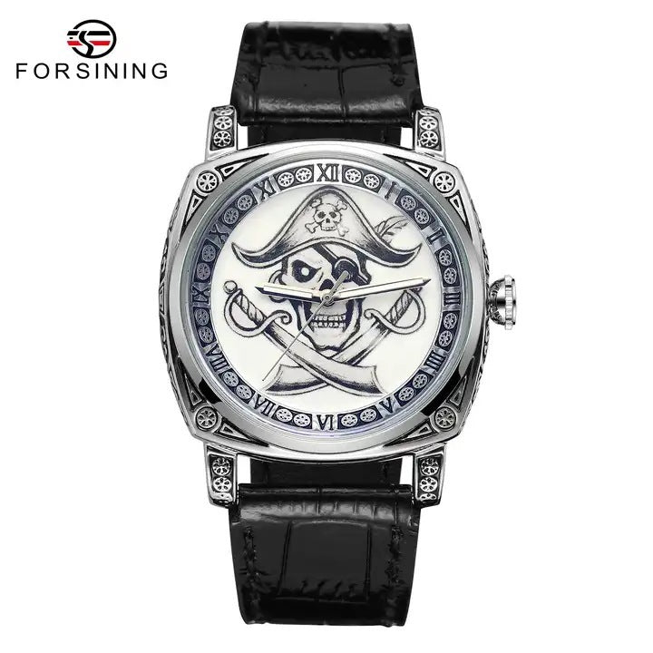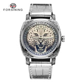 Make a bold statement with the Forsining men's dragon tiger pirate automatic watch, designed for those who appreciate power and artistry in a timepiece. Featuring a striking square dial with intricate dragon, tiger, leopard, and pirate motifs, this mechanical watch merges fashion with storytelling.