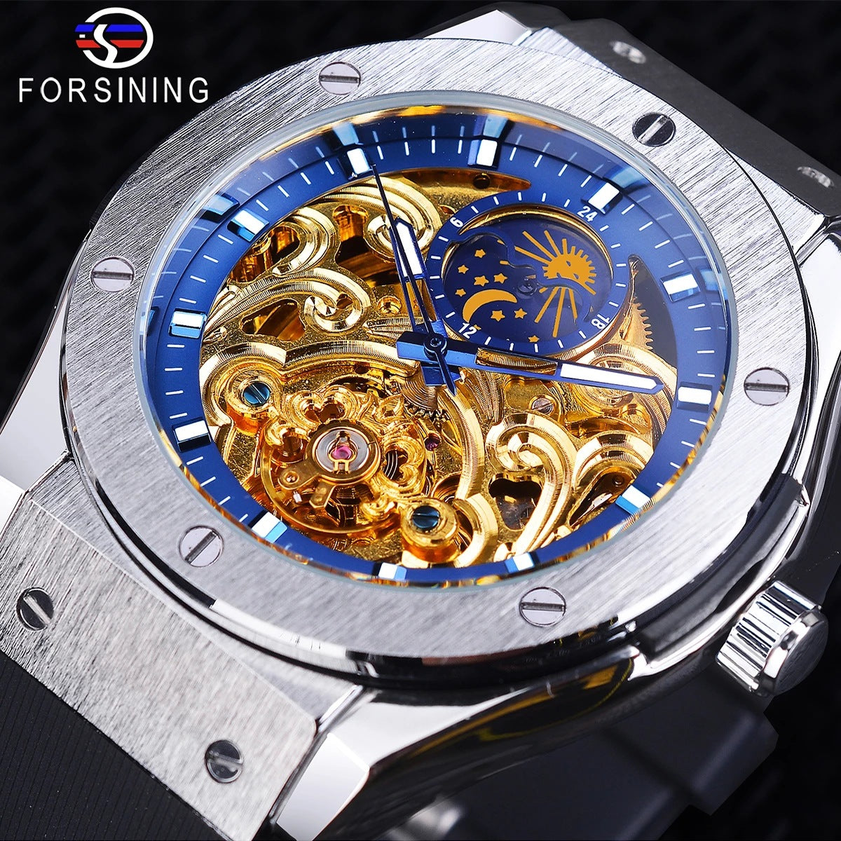 Designed for the modern gentleman, this moon phase mechanical watch blends sophisticated aesthetics with reliable performance. The fully automatic movement is encased in a stylish skeleton dial, revealing the intricacies of its internal mechanics.