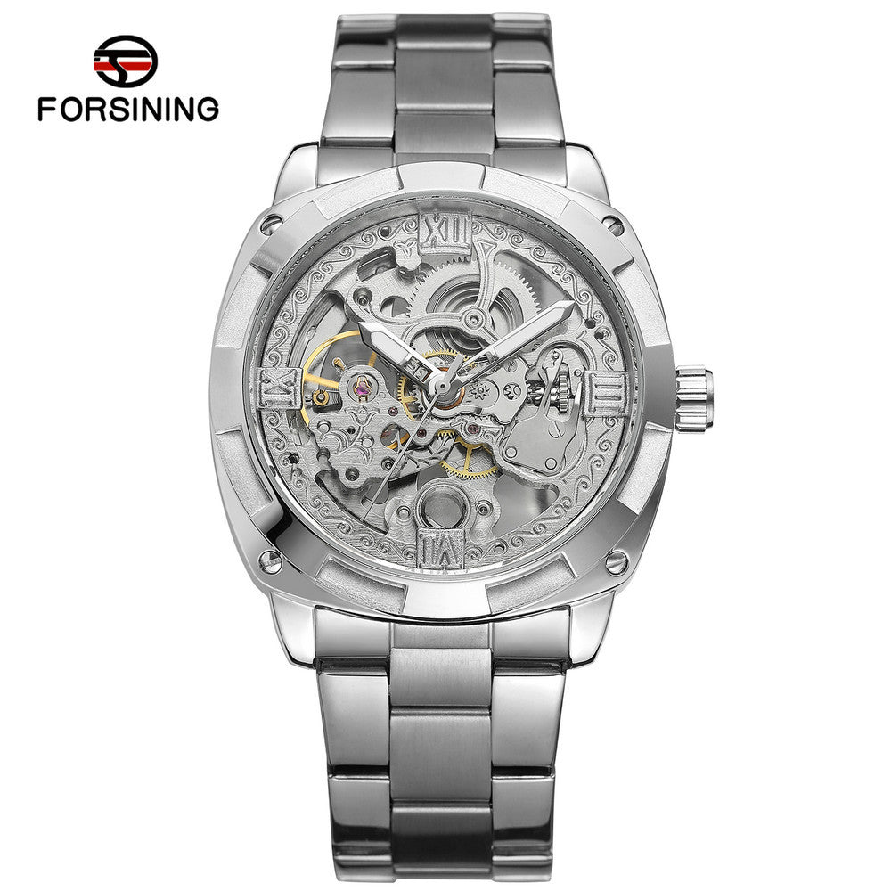 Make a bold statement with this Men's Stainless Steel Skeleton Watch, crafted for those who value both style and precision. Featuring a robust 41mm round case, this mechanical timepiece showcases a striking hollow dial with a perspective window, revealing the intricate movement within.